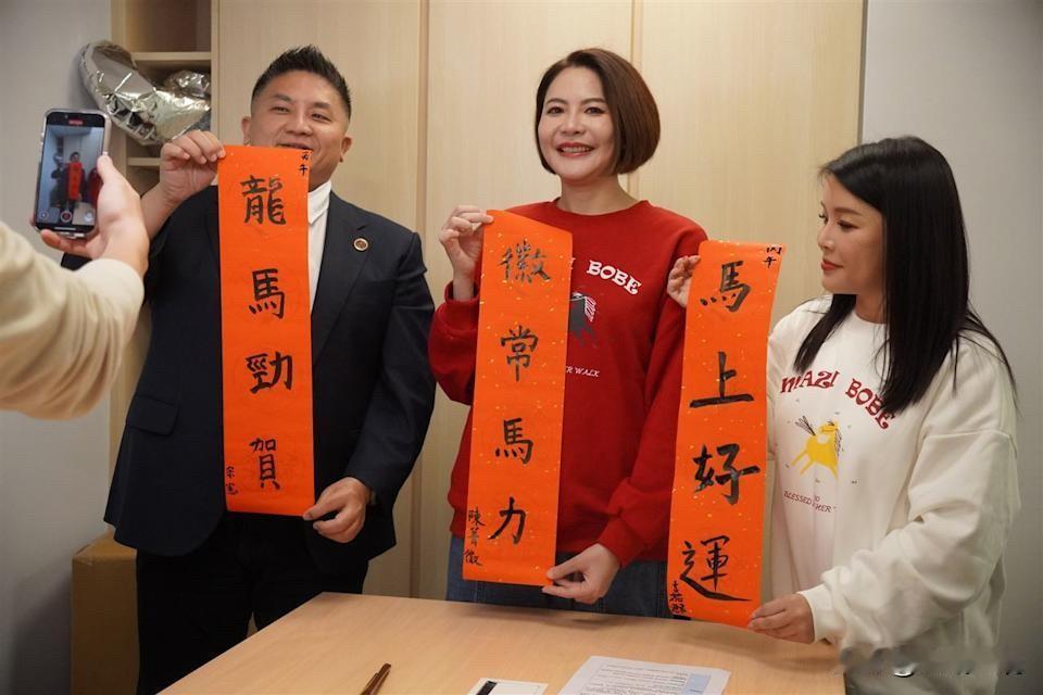 陈菁徽、吴宗宪、张嘉郡齐写春联贺新年 迎接新春,国民党立委陈菁徽、吴宗宪、张嘉郡齐聚挥毫写春联。陈菁徽表示,邀请两位未来要参选县市首长的委员一起,因为平常在地方跑行程,一定有很多机会要写字,借此机会崭露书法功力,写下新春的目标,以及对于选区的选民有什么期待。 吴宗宪打趣说,自己手机的输入法很厉害,至于书法就普通;张嘉郡则表示,自己有在推广书法,并谦虚的说自己写的不怎么好。 三人分别写出:陈菁徽“徽常马力”,吴宗宪“龙马劲贺”,张嘉郡“马上好运”。