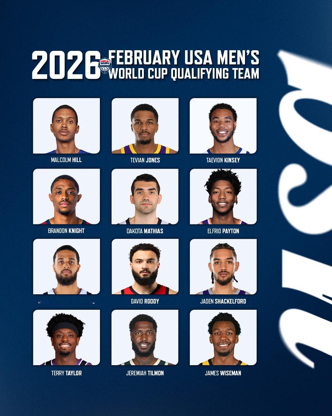 美国篮球协会今天公布了参加2026年2月美国男篮世界杯预选赛的12人名单和教练组名单。美国男篮将于2月26日和3月1日分别在加利福尼亚州奥申赛德的Frontwave Arena迎战多米尼加共和国和墨西哥。