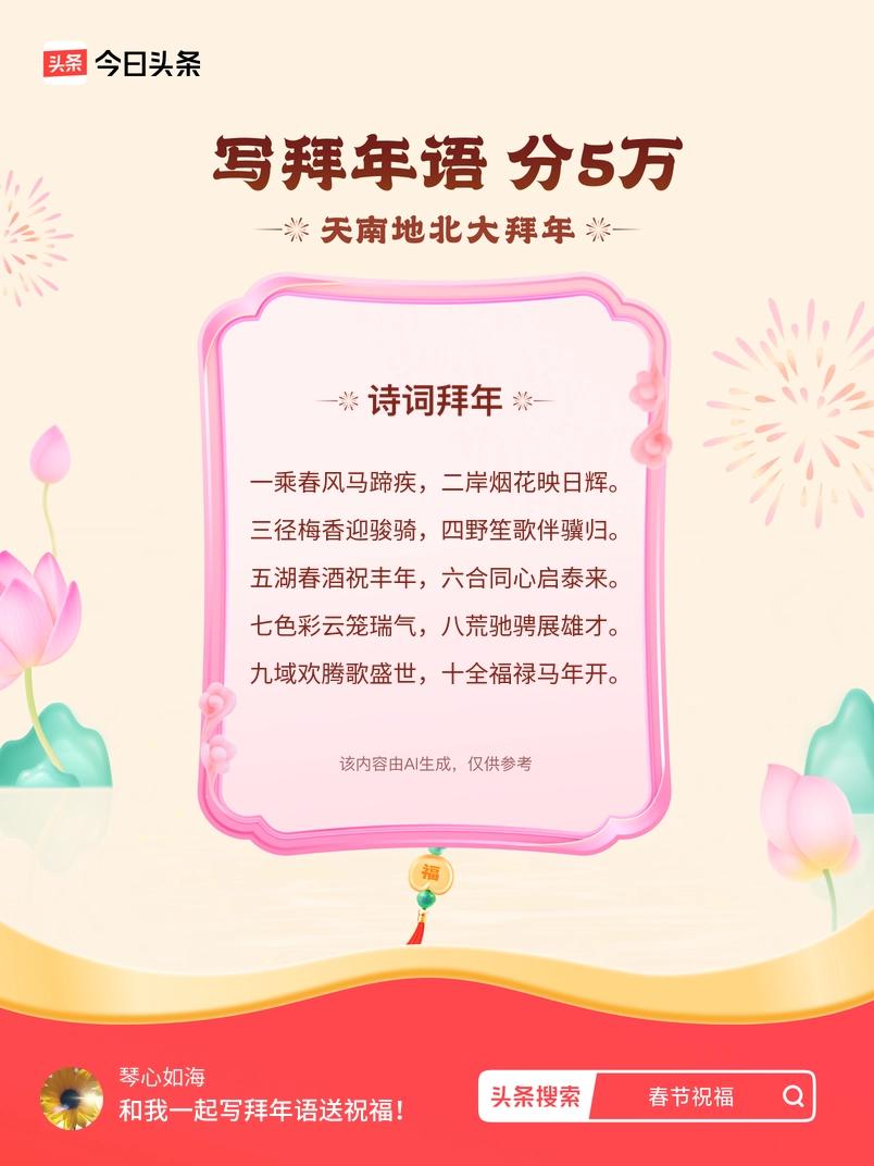 三径梅香迎骏骑,四野笙歌伴骥归。 五湖春酒祝丰年,六合同心启泰来。 七色彩云笼瑞气,八荒驰骋展雄才。 九域欢腾歌盛世,十全福禄马年开。”!快来一起写祝福吧戳这里,一起领红包>