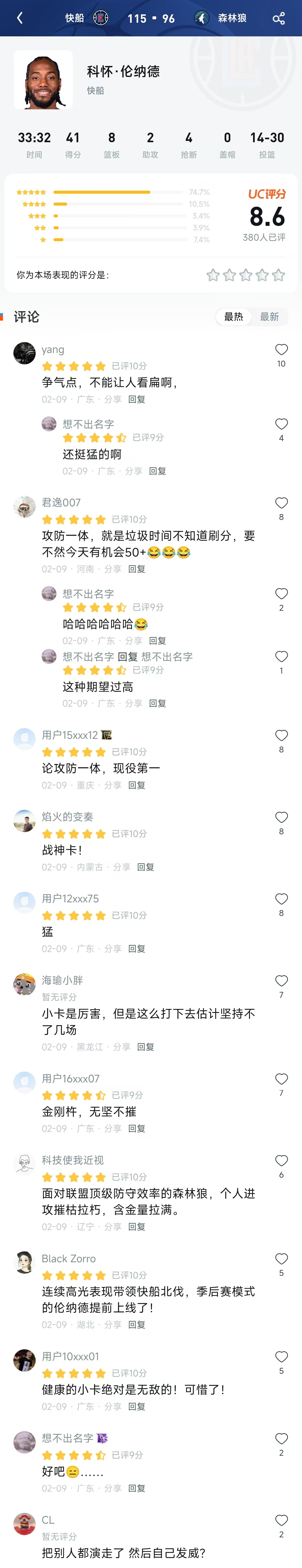 第一部分:原始评分截图(文字重现) 比赛信息: 快船 115 - 96 森林狼 球员: 科怀·伦纳德(快船) 个人数据: 时间33:32 | 得分 41 | 篮板8 | 助攻2 | 抢断4 | 盖帽0 | 投篮14-30 UC评分: 8.6分 评分人数: 380人已评