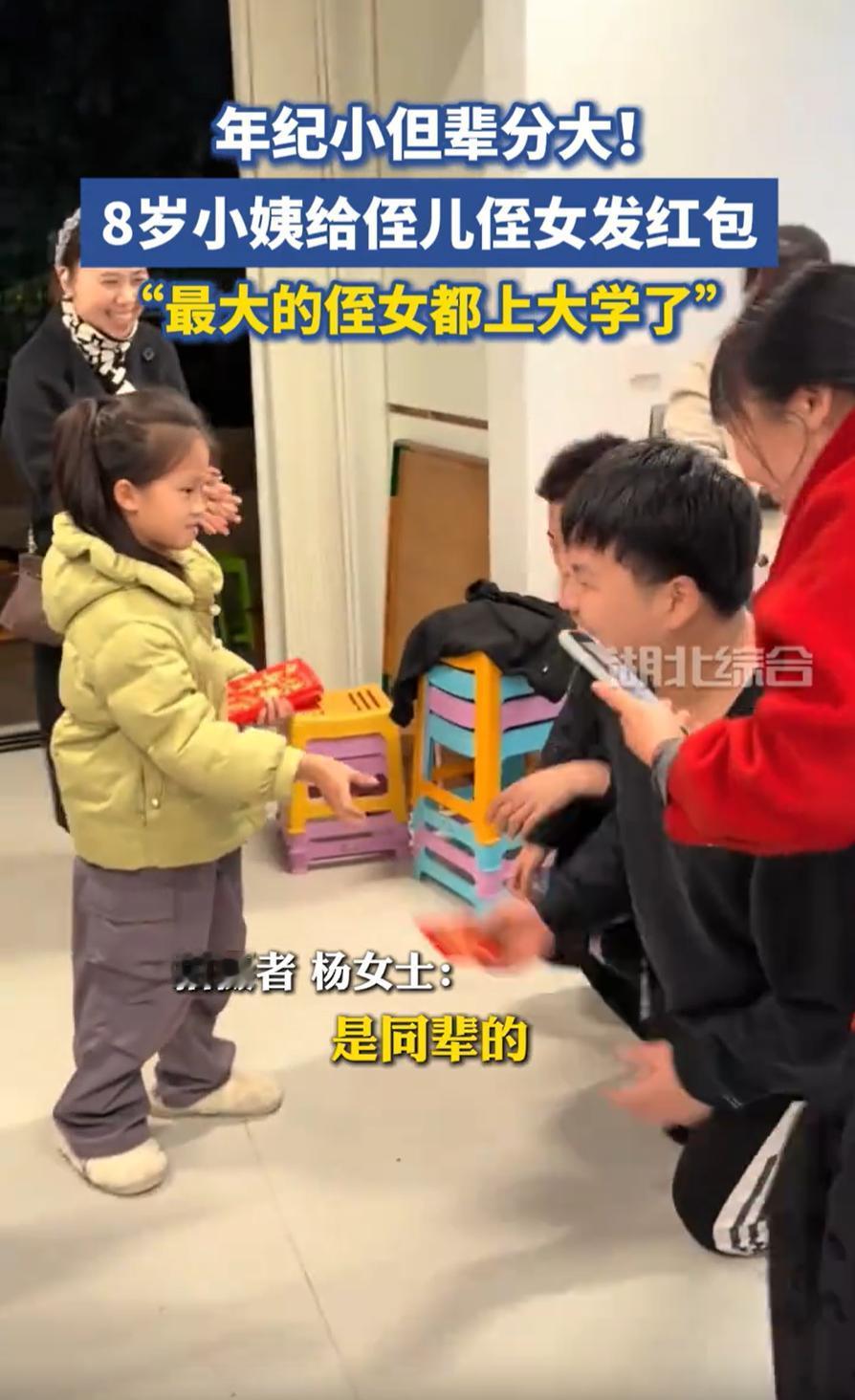这下解释不清了!重庆,一位8岁小女孩回家过年,同龄的孩子都是去领红包的,她却是给人发红包的,只因她的辈分太大了,有些侄女甚至都已经上了大学,还是要跪在地上领红包,现场也是又尴尬,又好笑 这位8岁的小姨今年只有二年级,在家里如果论年纪几乎是最小的那一个,可如果论辈分却是小姨那一辈,过年回家,她手里拿着一堆的红包给晚辈们发 最逗的是她还有个硬性规定:不跪不给钱。一开始那些比她大的侄儿侄女们谁都不好意思跪,觉得太丢人,有的还想仗着熟想浑水摸鱼,结果小姑娘认死理,不给面子 最后是一个大男孩绷不住了,扑通跪下拜了这个小姨,顺利拿到红包。有了第一个开头的,后面的人也不纠结了,跪得那叫一个顺溜 视频发布者表示,发红包的小女孩和自己的儿子是同岁的,但女孩和自己却是同辈的,儿子还说两人都这么熟了,就不用跪了吧,但女孩有自己的原则 这种事听着新鲜,其实在咱们这儿不稀罕。农村老话讲萝卜虽小,长在辈上了。只要家族大、人口多,总有几户人家生孩子早,几户人家生孩子晚,一来二去就会出现这种年龄和辈分倒挂的情况。往前翻几年,还出过18岁外甥给3岁舅舅磕头的新闻,那场面比这个还戏剧化 说实话,这种辈分大的小孩,其实挺容易陷入尴尬,在学校被老师当小孩管,回家却被晚辈当长辈拜。时间长了,孩子自己也会困惑:我到底是大还是小? 不过从另一个角度看,这也是一种难得的体验。小小年纪就体验了一把当大人的感觉,手里攥着一叠红包,掌握着发钱的主动权,这种掌控感可不是每个同龄人都有的 说到底,过年不就是图个热闹嘛。跪拜的是传统,发红包的是心意,真正重要的不是谁跪谁、谁给谁,而是一家人还能整整齐齐坐在一起,该磕头磕头,该笑场笑场。这就够了