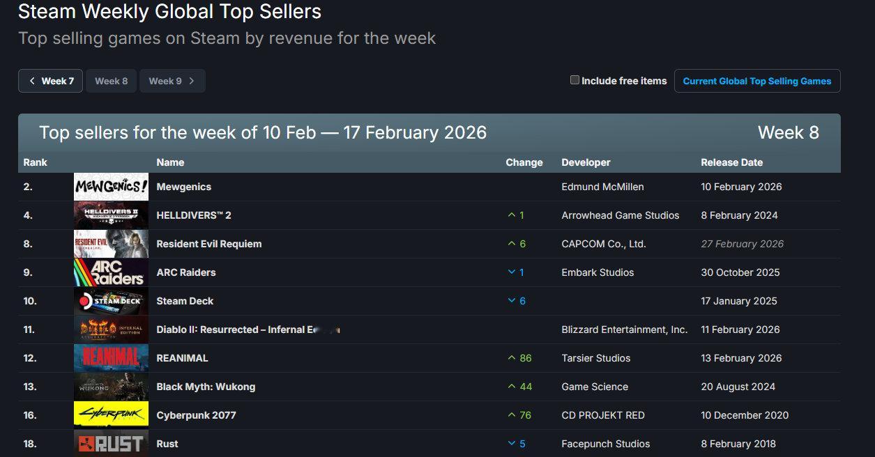 Steam最新一周销量榜出炉,统计时间2月10日至2月17日,《猫猫的结合》登顶,《绝地潜兵2》《暗黑破坏神2 重制版》《黑神话:悟空》等游戏上榜。