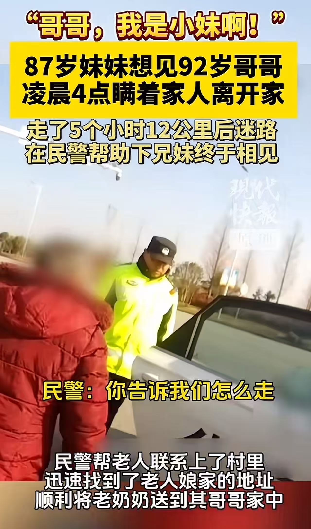 一句话,让在场所有民警眼眶发热。 他们赶紧扶她上车,打开暖风,递上热水。可老人记不清详细地址,只反复念叨:“我哥叫……住在老曹庄……”