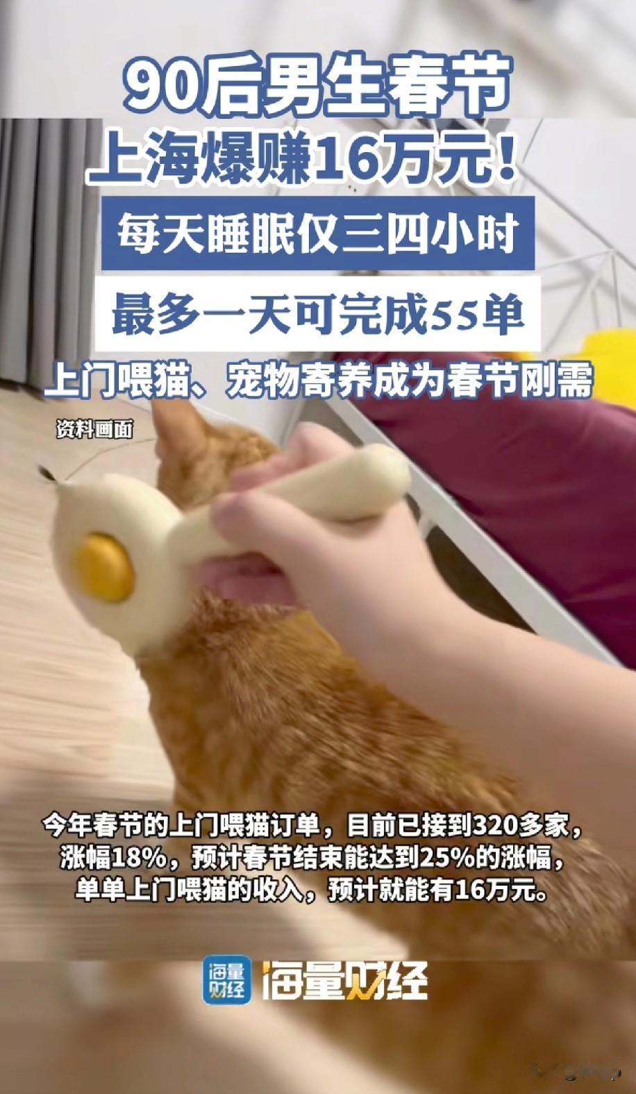 上海90后男生春节期间上门喂猫 20天左右的时间赚16万 春节期间返乡过年,不少人都都无法把宠物带回老家 所以喂宠物的这个行业出现了,这位90后已经上门喂猫九年了 今年春节他们团队共完成两千单 他自己完成了一千单 他们这个行业也够辛苦的,每天凌晨3点出门,忙到晚上10点到11点 他们是这样收费的,嘉定地区的是60-80元,其他地区是100,还有距离较远或者数量多的是200 春节期间就是挣“巧钱”的最佳时期,这个时间段都是不讲价的,毕竟他们是舍弃了走亲访友的时间,还有就是冒着被猫抓伤的风险,也是不容易的,起早贪黑的,什么行业都不易