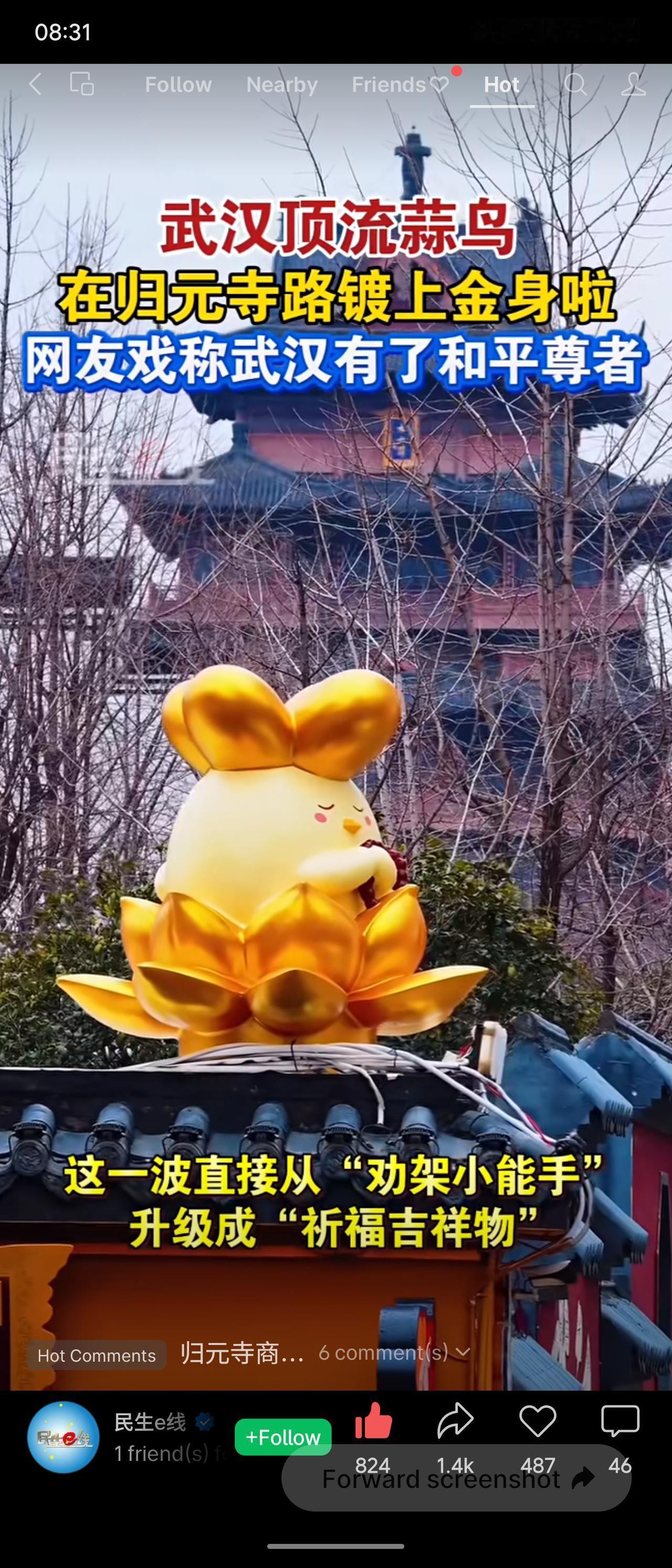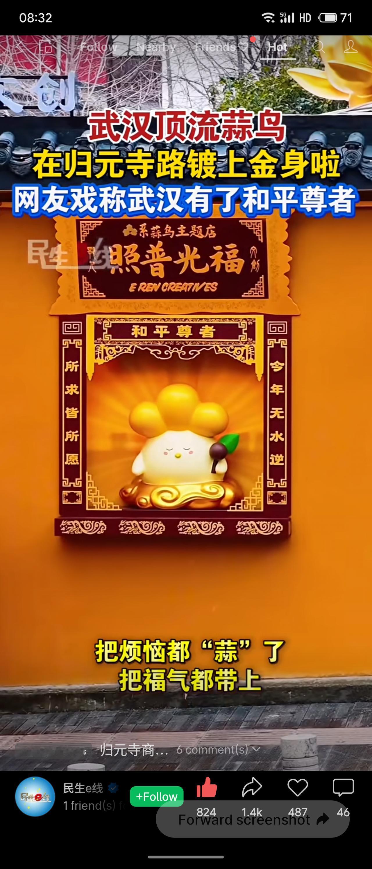 武汉网红“蒜鸟”在归元寺路镀上金身,从原本劝和的“蒜鸟蒜鸟消消气”升级为“金身加身万事兴”的祈福吉祥物,被网友戏称“和平尊者”。这只“劝架小能手”变身“祈福担当”,让本土IP与传统文化巧妙融合,既有趣又有温度。
