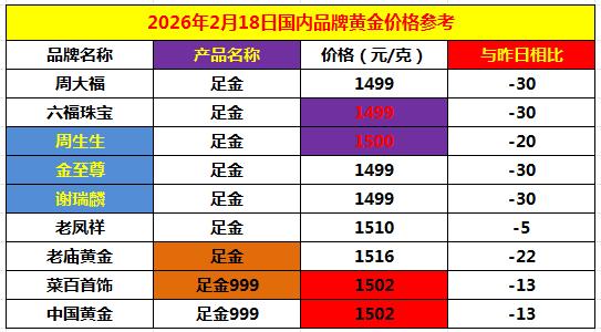 随着周二 国际金价的大幅回落, 今日国内品牌黄金饰品 纷纷下调销售价格。 通过下图的数据,可以明显看出: 国内品牌黄金下调5--30元不等。 老凤祥价格下调5元; 菜百和中国黄金下调13元; 周生生价格下调20元; 老庙黄金价格下调22元; 周大福、六福珠宝等四家品牌 价格下调30元。