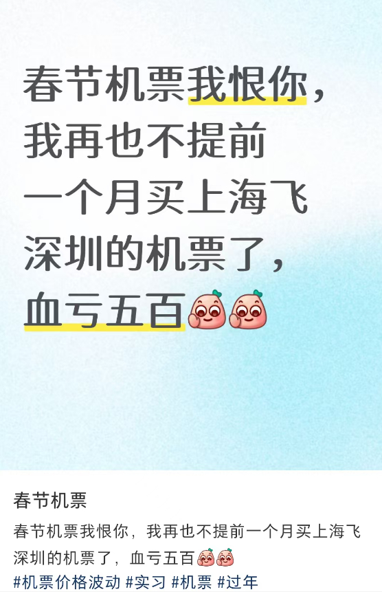 打开社交媒体,不少网友都感叹:今年春节机票也太便宜了吧!有人表示机票买早了,临近过节一看被狠狠“背刺”。评论区不少小伙伴纷纷表示赞同,有人称一家四口亏了4000。