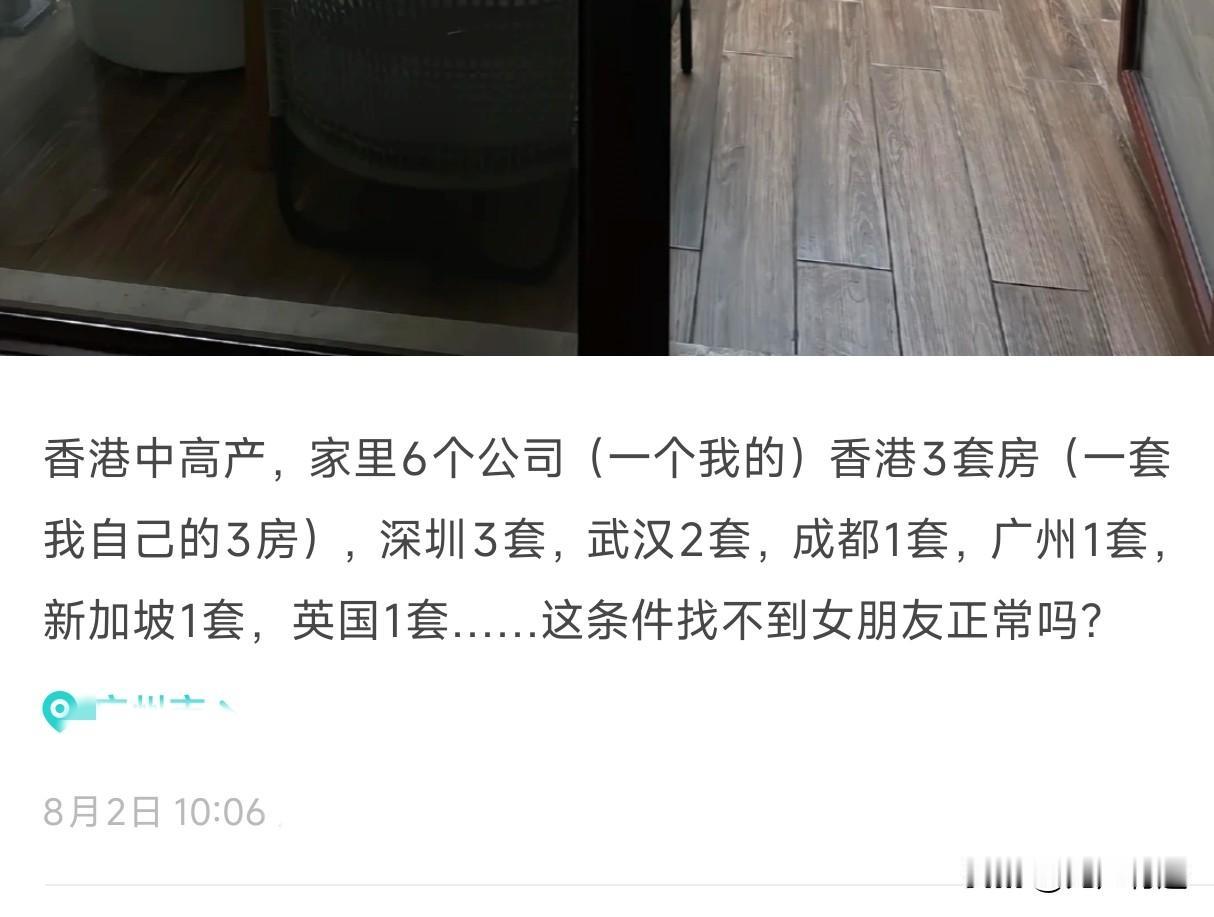 经济条件这么好,却找不到女朋友,他自己不懂,我们普通人更不懂? 有位男网友经常在网上发文抱怨自己找不到女朋友。 在现实生活中我们对于抱怨找不到女朋友的男生,习惯性看法是,因为他穷,物质基础差。 可是这位该男网友情况却截然相反,他并不穷,经济条件基本可以说打败国内%80以上的男生。 根据该男网友自己的描述,在香港他家属于中高产家庭,家里6个公司,有其中一个公司是属于他自己的,而且在国内几个一二线主要城市都有房产,国外也有。 按照常理,这么厚实的家庭条件,找女朋友,应该是件很容易的事才对,我们普通人这样想。 该男网友心里自然也会觉得这件事对他来说应该不难才对。 然而现实是,他却和很多经济普通的男生一样面临着找不到女朋友的难题。 这种一反常态的事,不仅我们普通人疑惑,当事人自己也很疑惑。 最后还反问,他自己这样的条件也找不到女朋友是否正常? 当然该男网友只是说了他的家庭经济条件,其他个人信息一字不提,比如个人相貌,身高,体重,年龄等等。 也不知他找不到女朋友的是不是卡在除了经济条件之外这当中的某个点上?