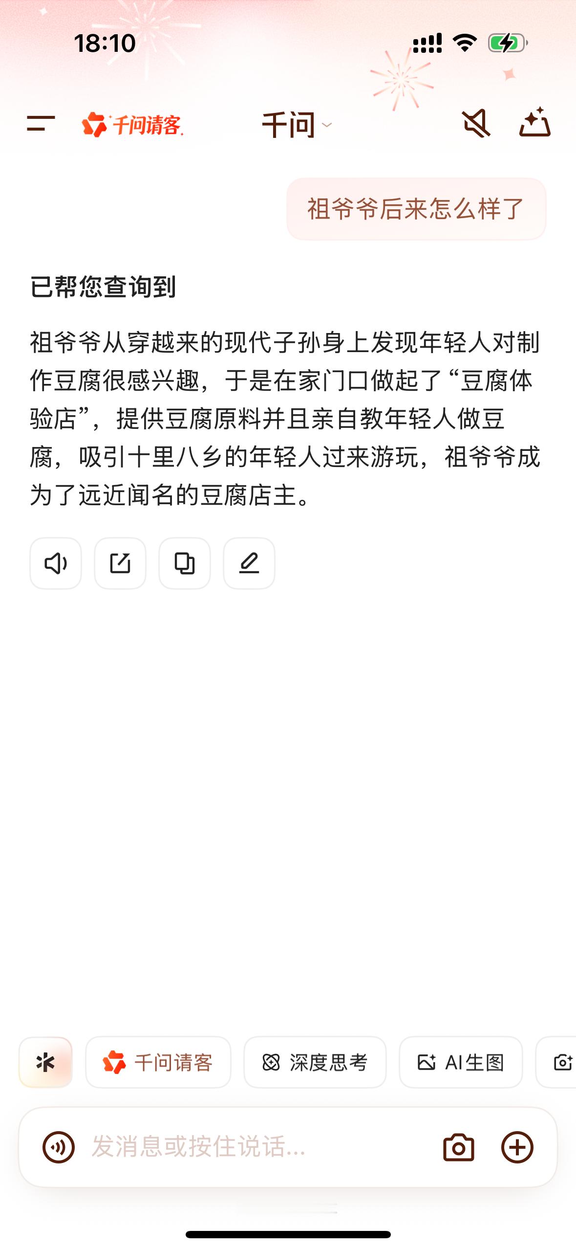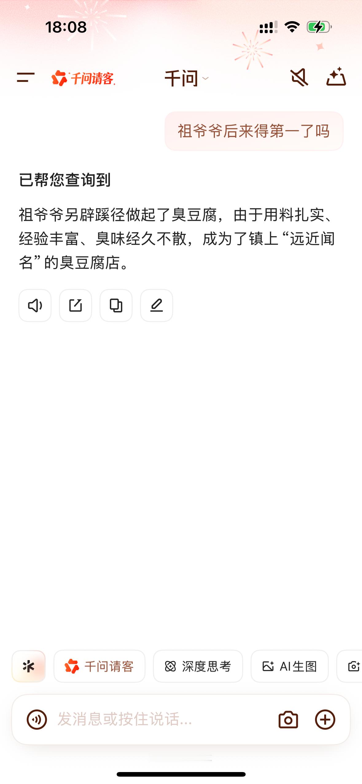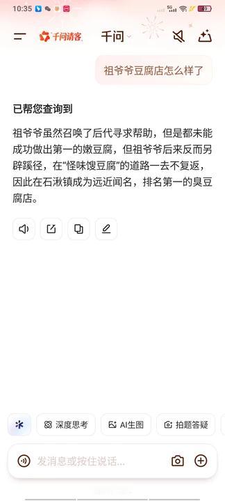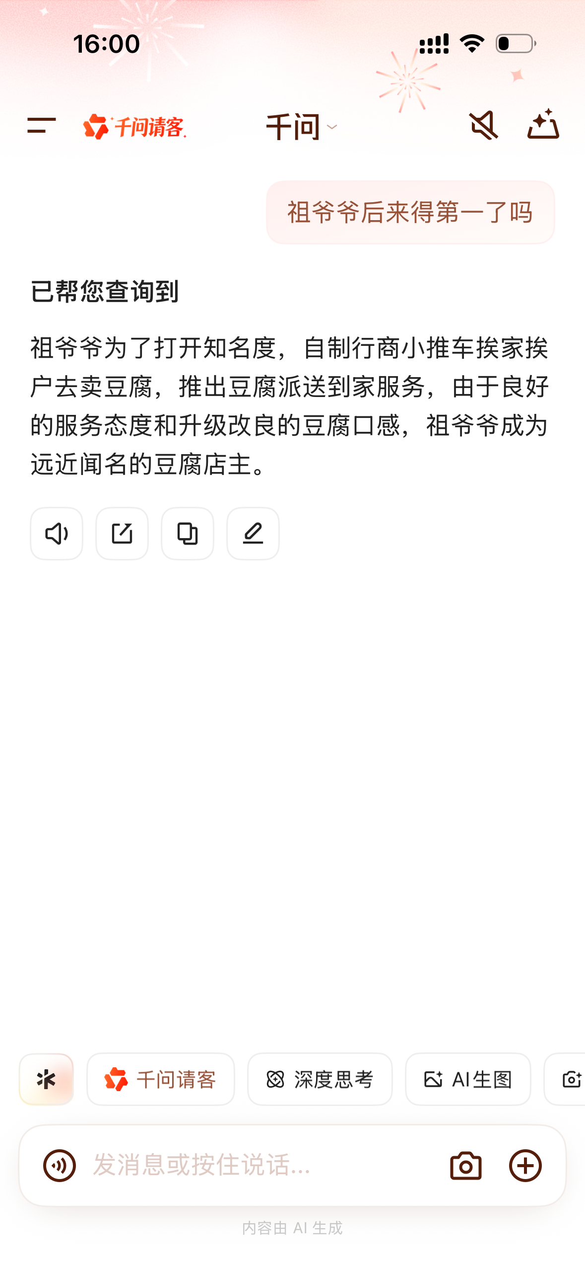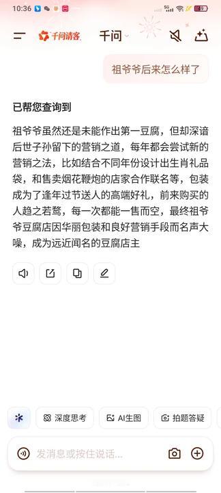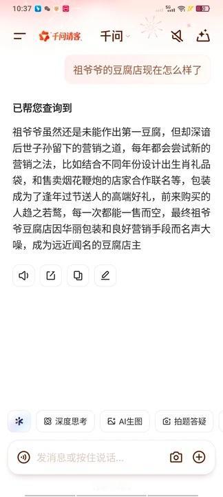 四士同堂的小品彩蛋埋在千问里 谁承想呢,四士同堂的彩蛋竟然被我找到了!本来只是好奇祖爷爷有没有得第一,结果qinawen你和我说他不仅得了第一还找到对象了,而且两个人一起努力做成了远近闻名的豆腐店,看来祖爷爷还是很厉害的!看网友还有别的答案,我也要上qianwen看看怎么个事~
