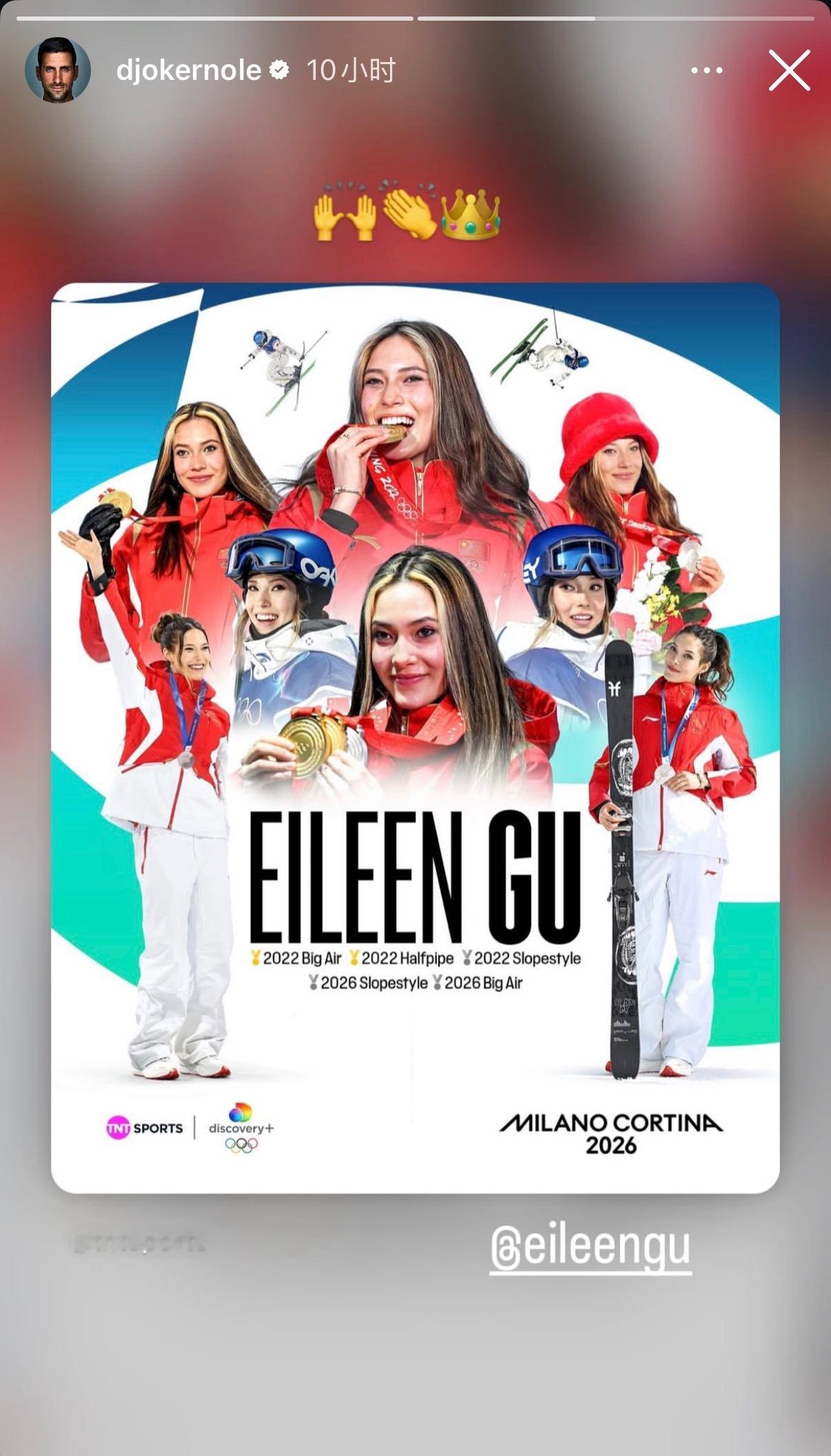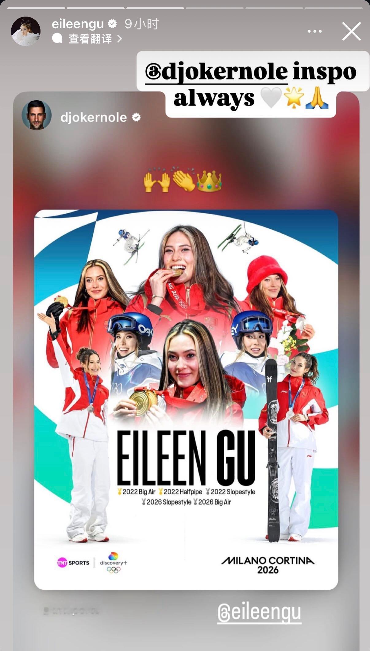 德约专门发快拍祝贺谷爱凌拿下5块奥运奖牌🏅