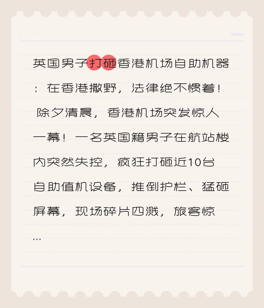 英国男子打砸香港机场自助机器:在香港撒野,法律绝不惯着! 除夕清晨,香港机场突发惊人一幕!一名英国籍男子在航站楼内突然失控,疯狂打砸近10台自助值机设备,推倒护栏、猛砸屏幕,现场碎片四溅,旅客惊慌躲避,混乱持续15分钟,全网震怒! 作为国际航空枢纽,香港机场每天人流如织,这本该是文明有序的公共空间,却成了这名外籍男子撒野的地方。他无视规则、肆意破坏,不仅严重扰乱机场秩序,更让出行旅客担惊受怕,性质极其恶劣。 就在众人愤慨之际,大快人心的转折来了!机场安保第一时间制止并报警,香港警方火速赶到,果断将其控制制服。搜查后还在他背包里发现无处方管制药品,当即以刑事毁坏、非法持有管制药品两项罪名拘捕。机管局强烈谴责暴力行为,要求全额追偿损失;按照香港法律,他将面临高额罚款、监禁,还要赔偿超20万港元设备维修费,为自己的冲动付出惨痛代价。 这一幕彻底打破了少数人“外籍特权”的幻想:香港是中国的香港,法律面前人人平等,不管来自哪里,只要触犯法律、破坏秩序,就必须接受严惩,没有例外,更没有特权! 从现场处置到依法追责,全程干脆利落,既守护了公共安全,也捍卫了法治尊严。这就是香港的法治底色,这就是中国土地上的公平正义——不惹事,但绝不怕事;不排外,但绝不容许肆意妄为。 任何外籍人士,都应尊重当地法律与公序良俗,把任性当特权、把违法当个性,走到哪里都行不通。在香港撒野,就要按香港法律受罚;在中国土地上违规,就必须承担后果。 为香港警方果断处置点赞!为法治香港撑腰!规则不容践踏,法治不容挑衅,这才是文明社会该有的样子,也是我们所有人该守住的底线!