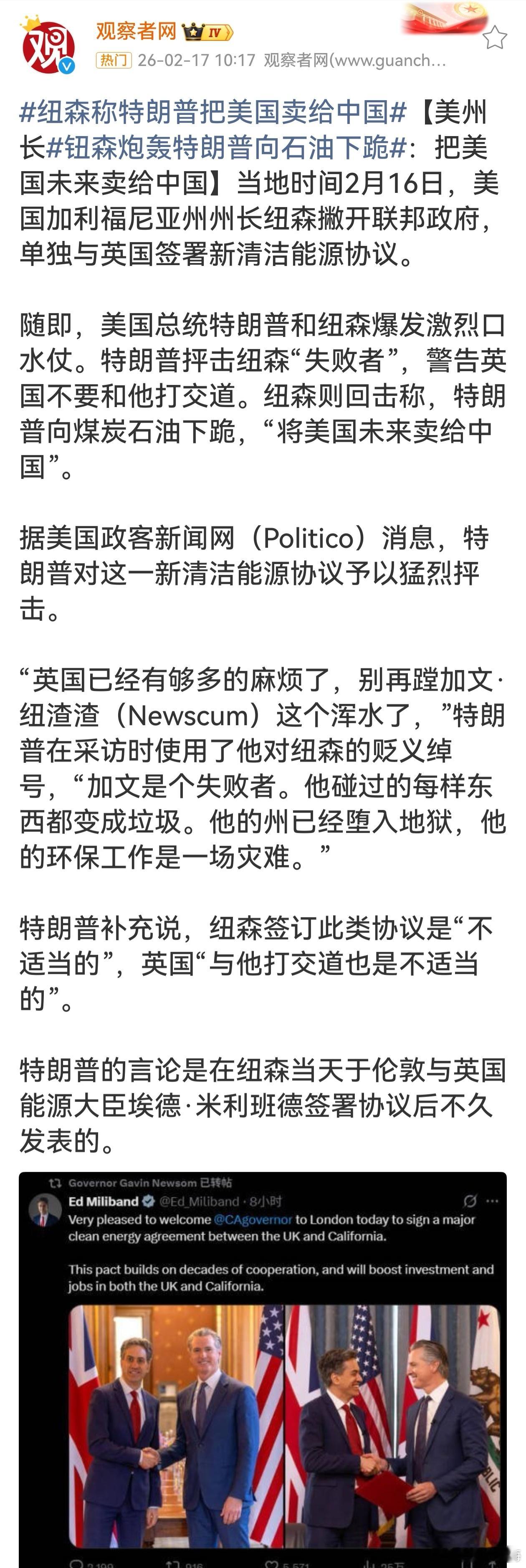 特朗普警告英方不要与纽森合作美国政坛这一闹剧凸显内部矛盾激烈。特朗普与纽森的口水仗,是联邦与州权力分歧、不同能源政策理念冲突的体现。一方抨击对方“失败”,另一方指责对方“出卖未来”,全然不顾国家整体利益,在争吵中内耗,损害的是美国自身发展与形象。