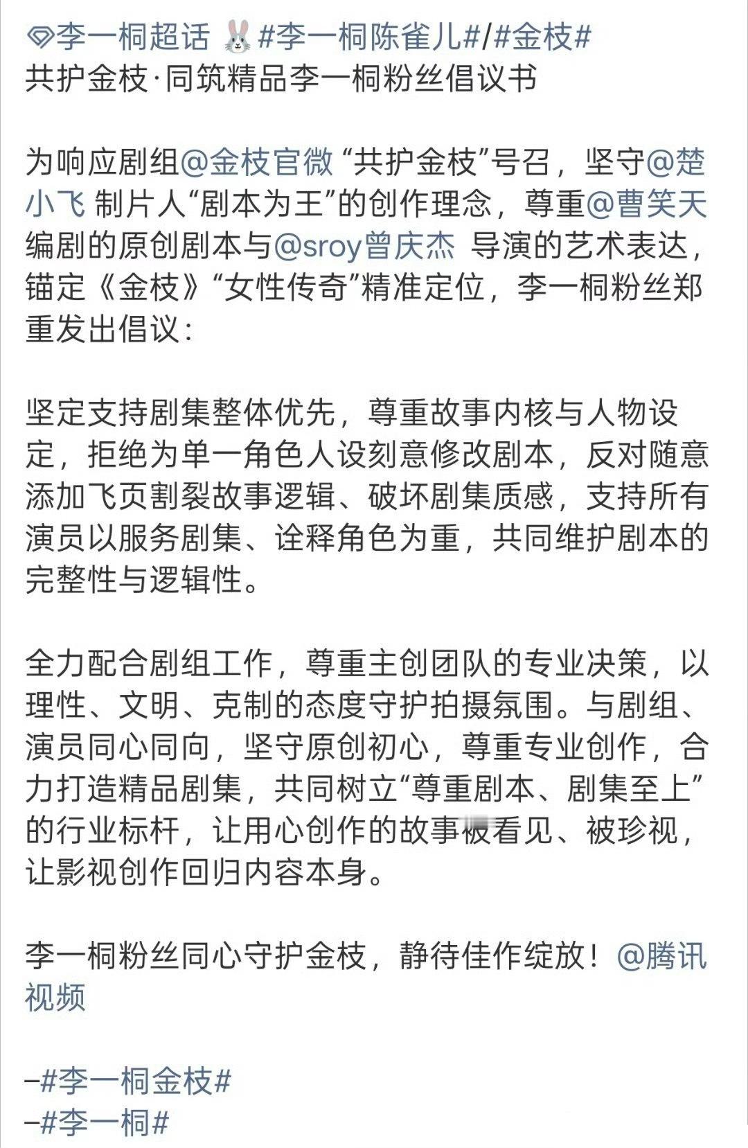 李一桐陈星旭粉丝分别给金枝剧组的倡议书 :