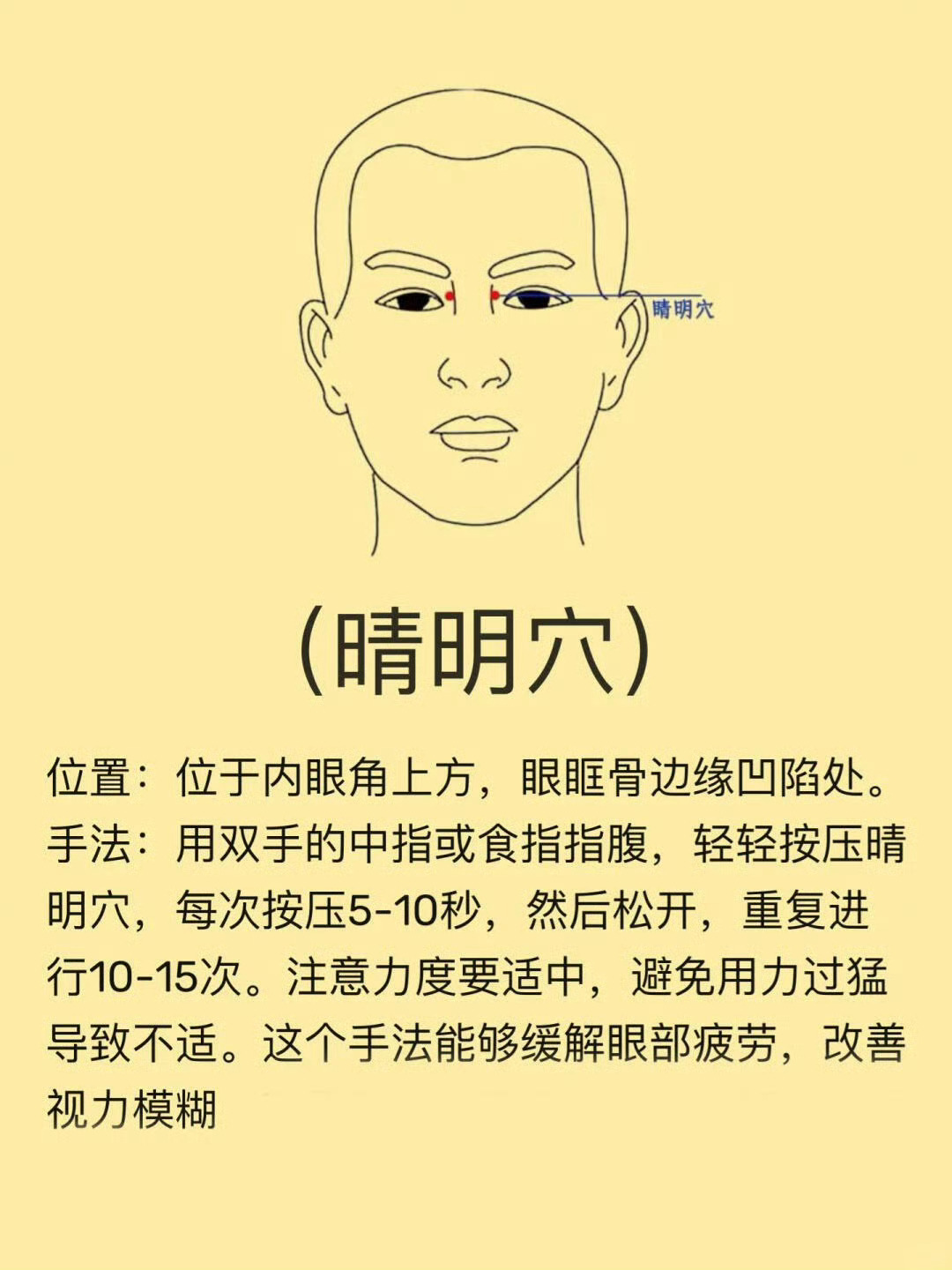 1.晴明穴2.攒竹穴3.鱼腥穴4.太阳穴5.四白穴坚持揉按这5个穴位,还要注意日常习惯1.清淡饮食保持良好的饮食习惯,避免辛辣刺激高碘的,合理摄入复含膳食纤维的蔬菜水果等2.规律作息养成早睡早起的好习惯,保持每天8小时左右的睡眠时间坚决不熬夜3.情绪调整平常工作或学习中尽量不生气,不焦虑,保持平和,可以培养爱好分散情绪注意国医的精诚力量健闻登顶计划武医张鹏