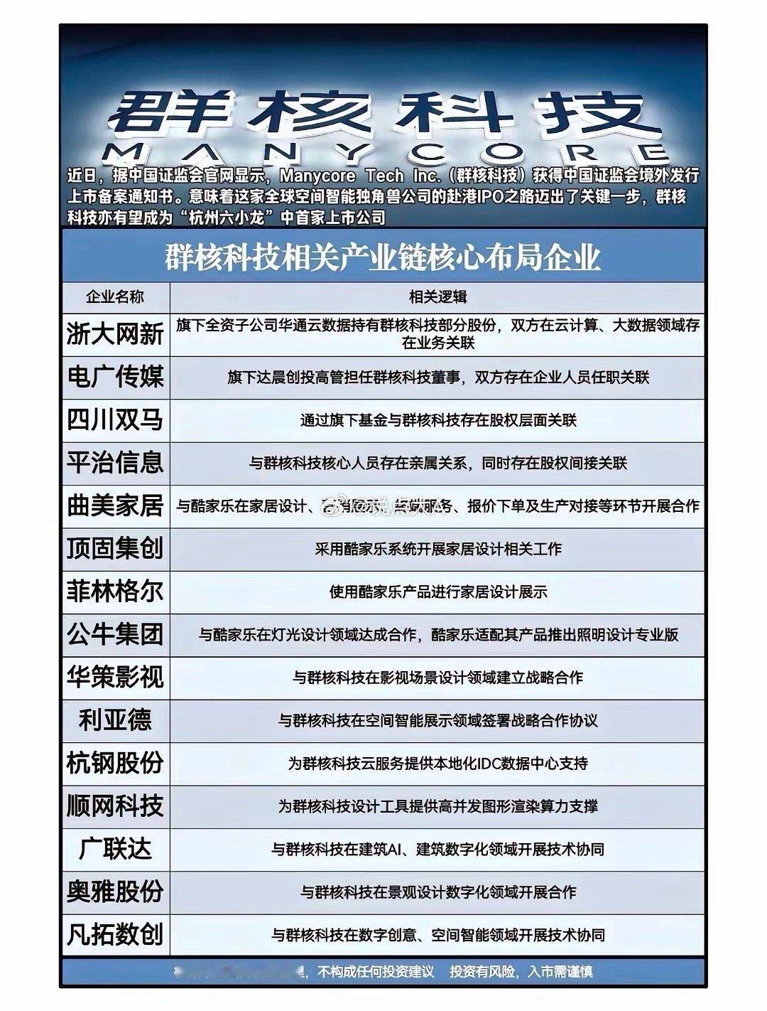 重磅利好,群核科技IPO再提速!证监会境外上市备案通知书到手,“杭州六小龙”首上市呼之欲出?相关概念龙头企业有哪些?群核科技是中国最大空间设计软件提供商,市场份额约23.2%。属于“杭州六小龙”企业,公司的酷家乐是全球最大空间设计平台。2026年2月14日,获证监会境外上市备案通知书,拟赴港交所主板上市。群核科技相关概念从空间智能到数字孪生,这家独角兽的产业链布局已深度渗透:浙大网新、电广传媒、四川双马等企业股权关联,华策影视、利亚德、广联达等伙伴携手技术协同,酷家乐生态更是串联起家居设计全链路。资本风口已至,空间智能赛道的下一个巨头,会是它吗?(投资有风险,入市需谨慎)