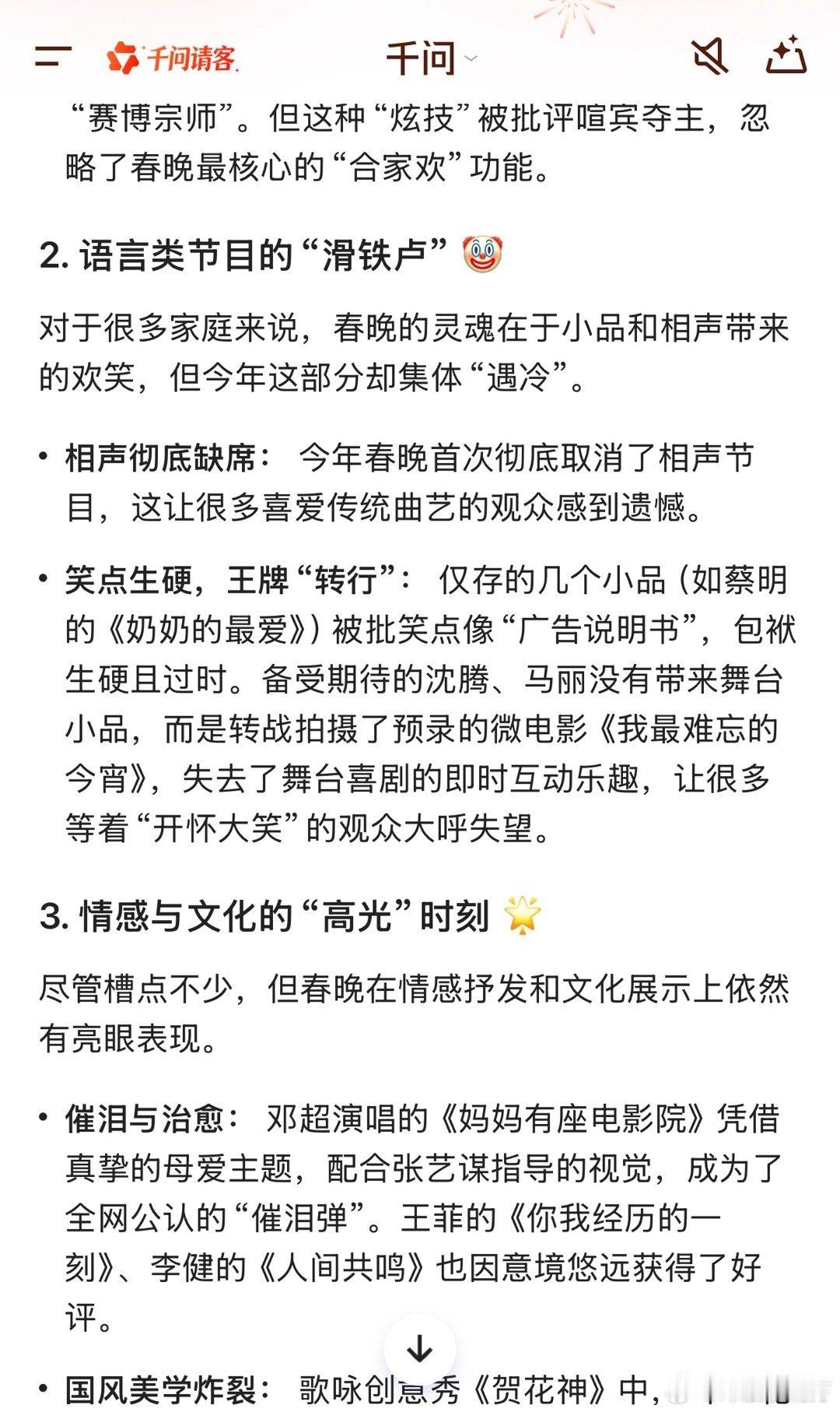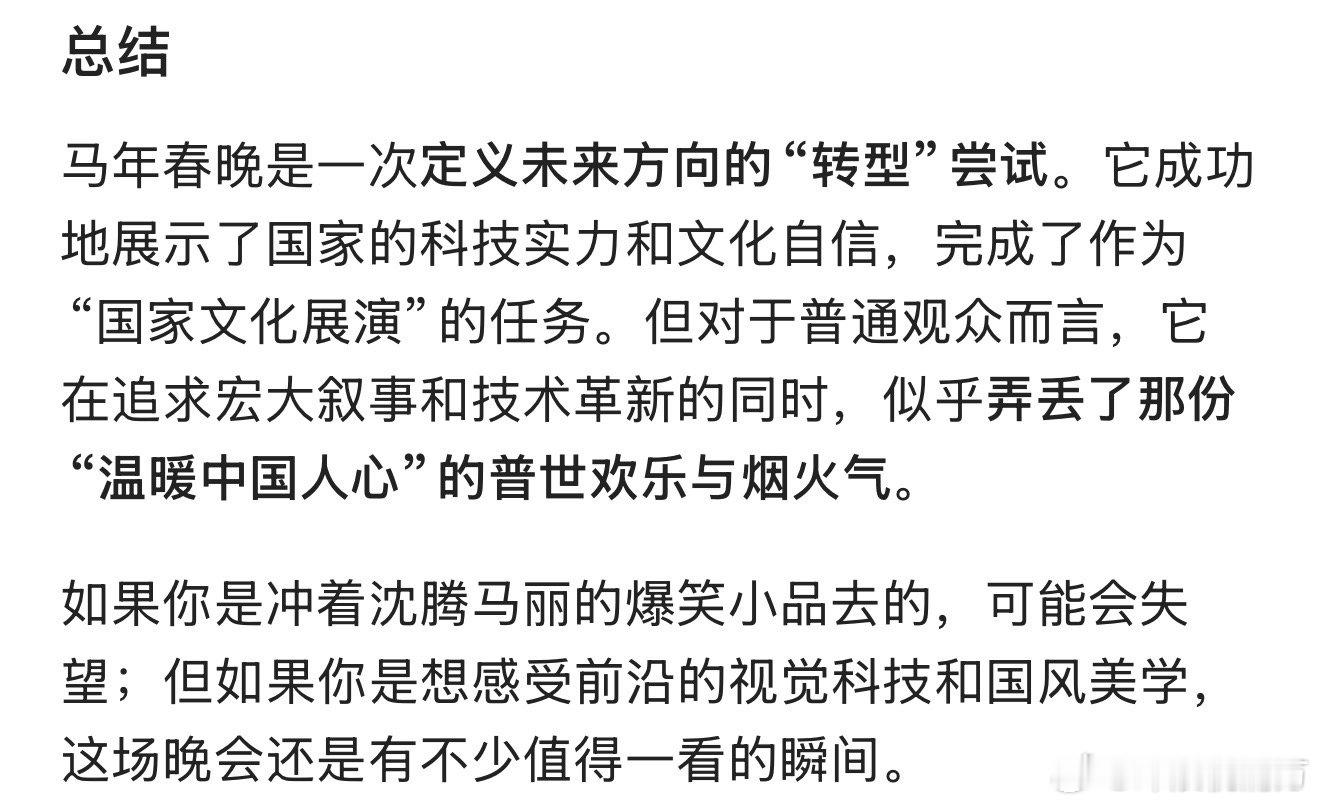 我AI聊春晚马年春晚评价版🈶,AI总结还挺全面,优缺点解析得十分精准透彻啊,还有些许毒舌~“马年春晚是一次定义未来方向的“转型”尝试。它成功地展示了国家的科技实力和文化自信,完成了作为“国家文化展演”的任务。但对于普通观众而言,它在追求宏大叙事和技术革新的同时,似乎弄丢了那份“温暖中国人心”的普世欢乐与烟火气。”“邓超演唱的《妈妈有座电影院》凭借真挚的母爱主题,配合张艺谋指导的视觉,成为了全网公认的“催泪弹”。王菲的《你我经历的一刻》、李健的《人间共鸣》也因意境悠远获得了好评。”