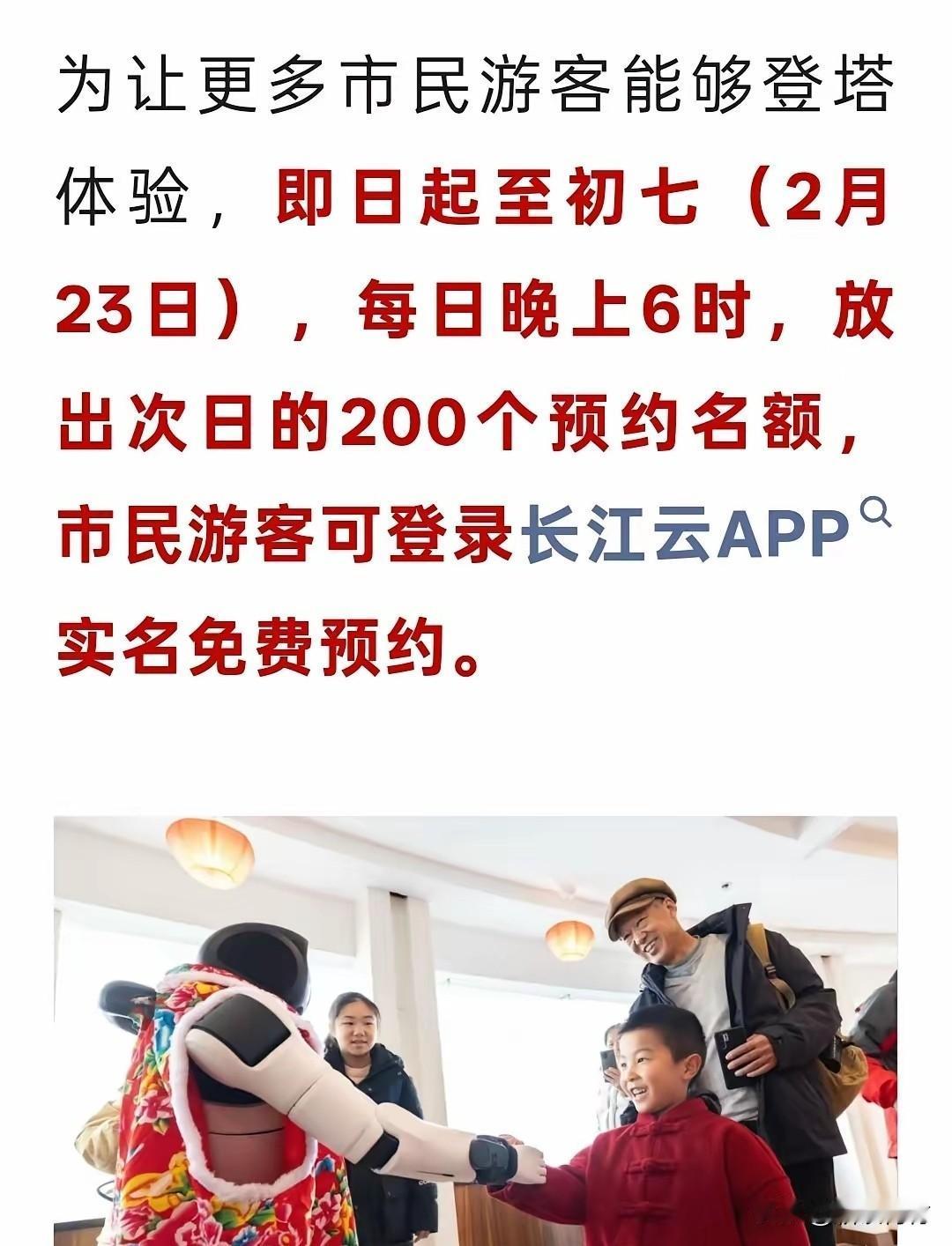 武汉龟山电视塔的免费体验票你抢到了吗? 昨天大年初一已经有人登上焕新的龟山电视塔体验了77层高空观景,并晒出了照片,相信很多人也心痒痒想去了吧! 可惜的是每天只有200个名额,一放票马上秒空。现在是初一到初七都可以免费预约体验,每晚6点放第二天的票,在江云APP,有想要体验的可以试试运气,看看能抢到不?