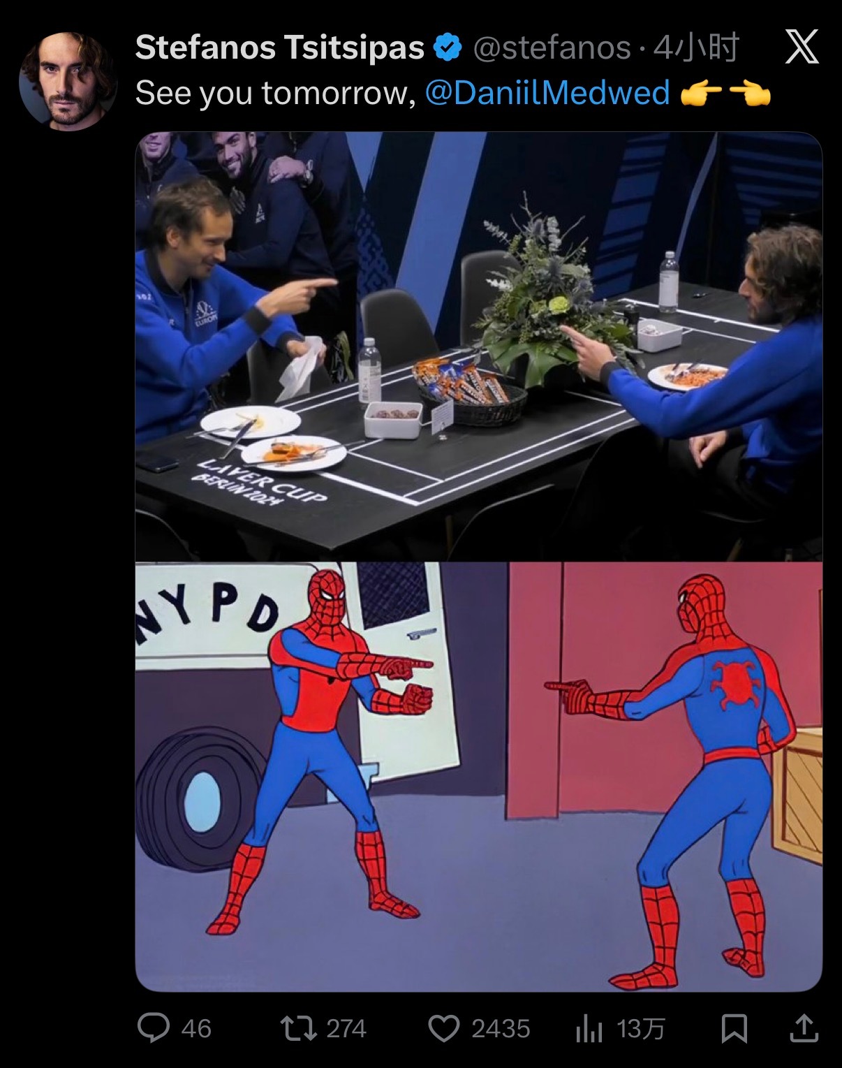 正主亲自下场抄过气CP西西帕斯主动艾特梅德韦杰夫,还配了张梗图,表示明天见