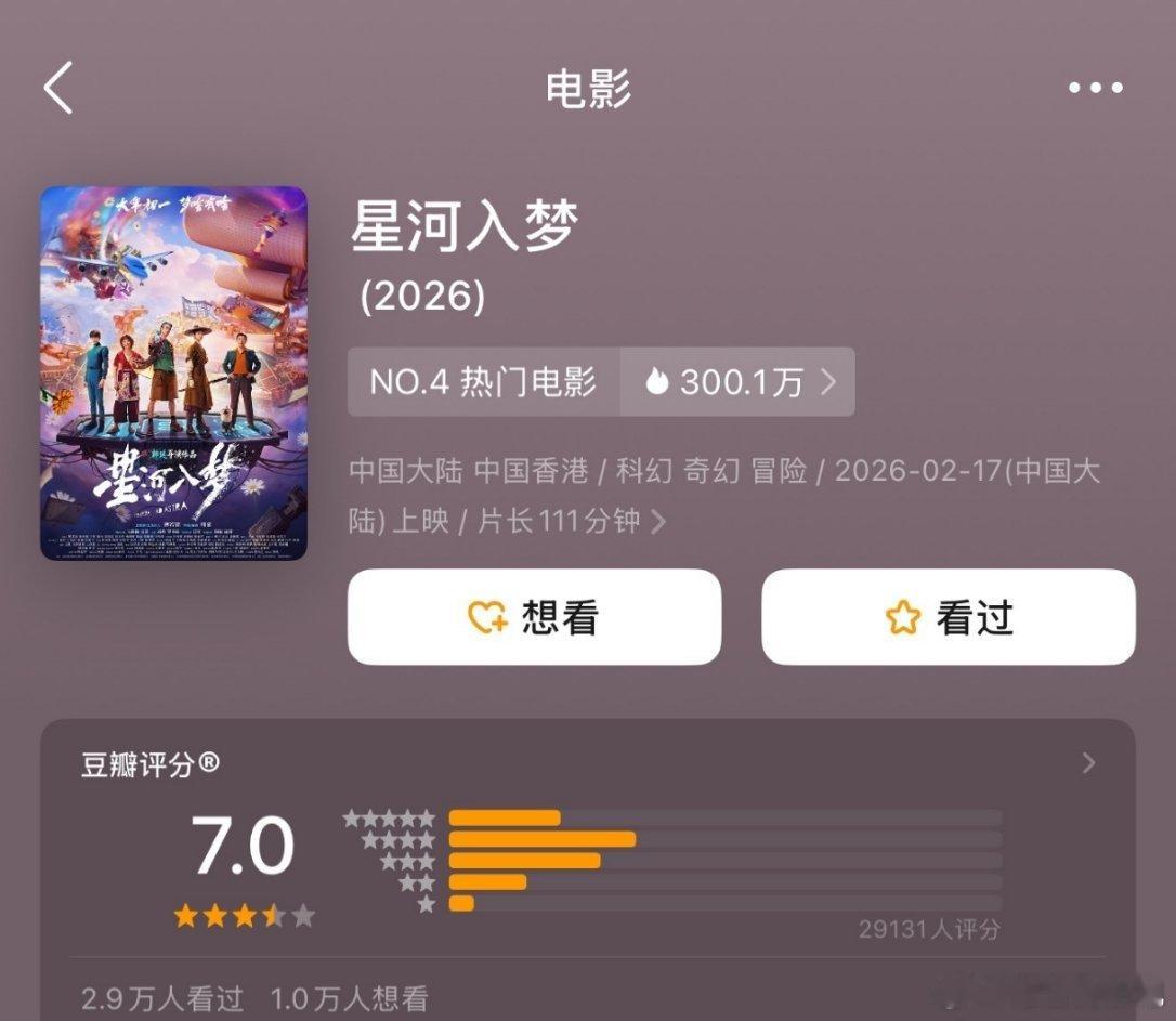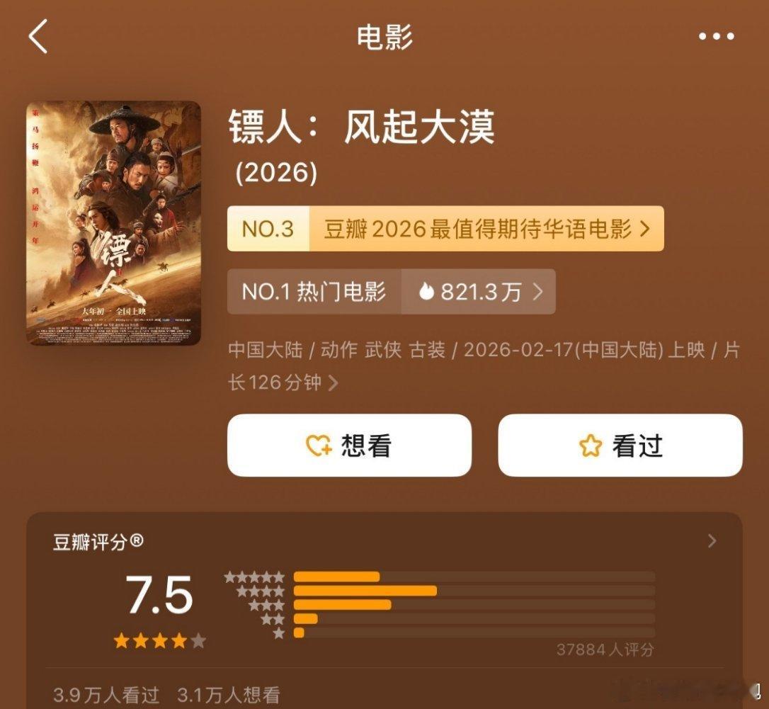 春节档三部电影豆瓣开分了,你们觉得这个分数是高了还是低了?符合预期吗?吴京、谢霆锋《镖人:风起大漠》7.5分宋茜、王鹤棣《星河如梦》7分沈腾《飞驰人生3》7.6分