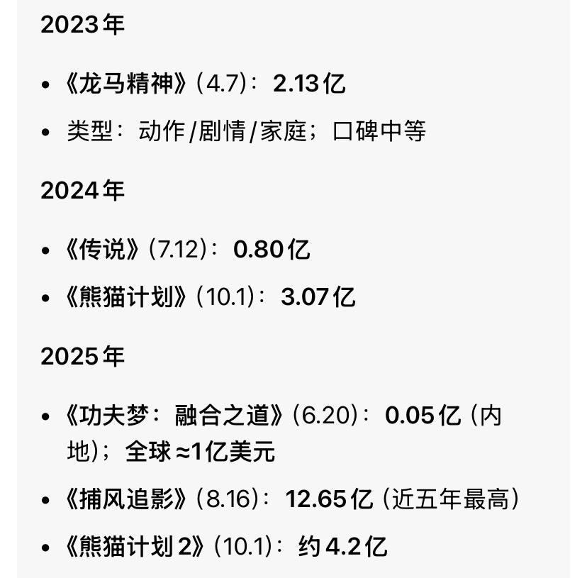 看来成龙的片酬也不是很贵吧。 新电影上映两天还未破亿。 再看他2023、2024、2025年主演的电影。 除去影院分成、制作成本,还有其他演员片酬,感觉成龙本人的片酬可能就几百万吧。 以前经常刷到演员天价片酬的新闻,比如某演员片酬一个亿,某演员日薪208万。 娱乐圈这个水真的很深啊。
