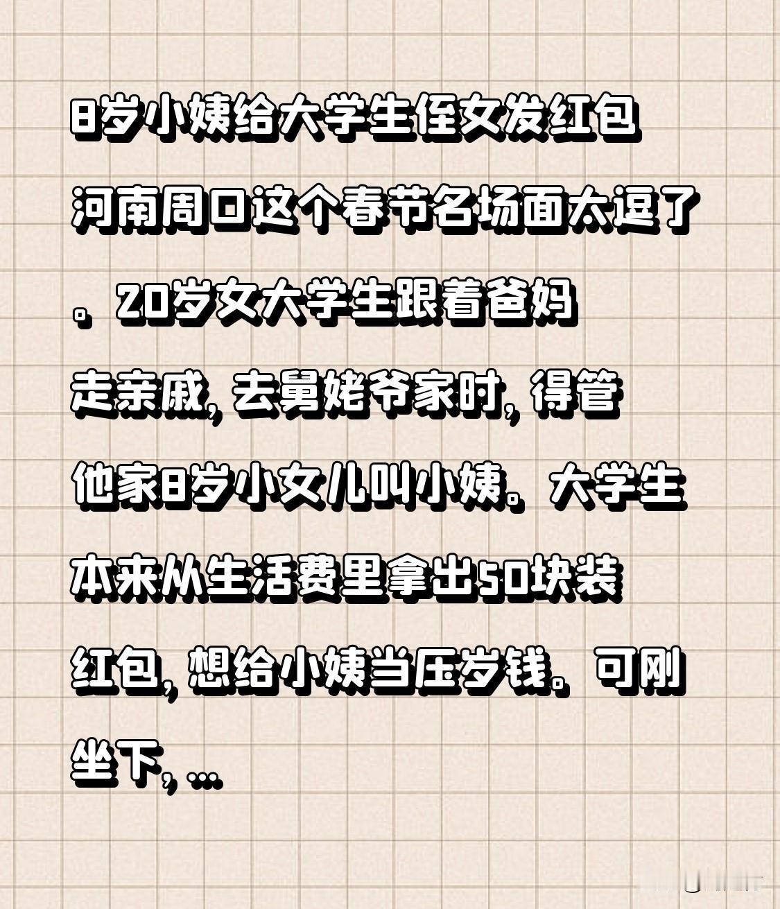 8岁小姨给大学生侄女发红包 河南周口这个春节名场面太逗了。20岁女大学生跟着爸妈走亲戚,去舅姥爷家时,得管他家8岁小女儿叫小姨。大学生本来从生活费里拿出50块装红包,想给小姨当压岁钱。可刚坐下,8岁小姨就从口袋掏出一沓连号新钱,抽出两张100块,踮着脚硬塞给侄女,那奶声奶气又正经的样子太可爱。这视频抖音播放量破3200万,点赞超220万。辈分碾压,还反向发红包,既好笑又暖心,也体现出良好的家庭教养。