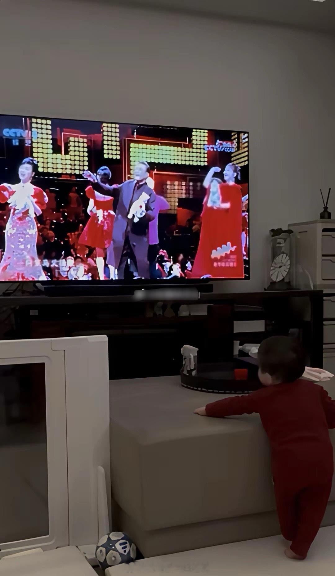 梁家辉在北京上春晚,俩女儿带孩子在家看春晚,混血外孙目不转睛