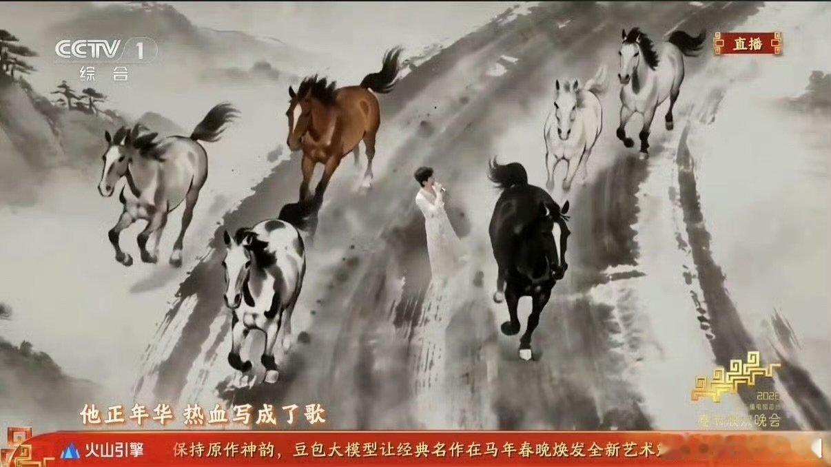 张杰春晚独唱张杰春晚独唱驭风歌AI水墨六骏踏画而出,张杰在流动的长卷中开唱,