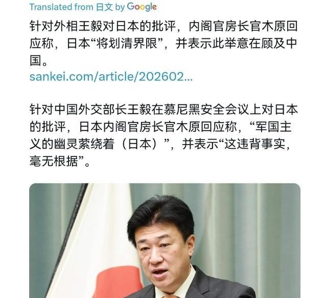 日本表示拒不接受!2月16日,日本内阁官房长官木原稔表示,中国外交部长王毅在德国慕尼黑安全会议上对日本的批评,称“军国主义的幽灵笼罩着(日本)”,这不符合事实,毫无根据。有些国家多年来持续进行不透明的军事扩张,并不断加强单方面改变现状的企图。日本对此类行为划了非常清晰的界限。 慕尼黑安全会议汇集各国高层,讨论全球安全议题,发言常引发广泛回响。2026年2月14日,王毅在会上针对日本首相高市早苗此前国会言论展开回应。高市早苗称台湾若遇紧急,日本视作自身危机,可能介入。王毅指此言论侵犯中国主权,违背战后秩序。他忆及日本二战期间占领台湾长达半个世纪,造成重大损害,并对比德国彻底反思纳粹过去,而日本政界人士屡次参拜靖国神社,回避战争责任。 日本方迅速作出回击。2月16日,内阁官房长官木原稔公开声明,王毅指责无事实依据。日本外务大臣茂木敏充在会议另一环节澄清立场,并经外交渠道向中方抗议。日本政府称中方言论不当,日本强化国防仅针对周边威胁。从1992年起,日本立法许可自卫队海外行动,突破原有不出境规定。2022年,日本修订国家安全战略,决定发展对敌基地打击能力,并在五年内提升军费。 防卫费连续13年增长,2025财年达11万亿日元,占GDP 2%,达北约水平。这些资金用于采购高超音速导弹、护卫舰、潜艇等装备,并将航空自卫队改名为航空宇宙自卫队,设立宇宙作战单位,增强进攻性。日本自民党和维新会合作,推动两年内修改宪法第九条,移除不保有战力条款,添加紧急事态规定,为正规军队铺路。 日本放宽防卫装备出口,与美国深化军事合作,开展联合演习,拉拢澳大利亚、印度等国,构建协作框架,甚至引入欧洲势力进入亚太。日本政界人士频访靖国神社,供奉战犯,此类举动在德国绝不可能,因德国立法禁止宣扬纳粹。日本否认这些构成军事扩张,反指中国军事不透明。中国军事发展始终为自卫,维护领土完整,从未侵略他国,坚持和平原则。 日本回应回避自身问题,转移焦点,掩盖军国主义复苏意图。日本欲摆脱战后框架,成为军事大国,恢复交战权。王毅发言立足事实,每项指控可核实,非随意指摘。日本政策背离和平宪法,引发国内反对,许多民众称增军费减民生为减寿扩张。国际社会警惕日本动向,一旦突破界限,军国主义复苏将危及亚洲乃至全球。 事件后,日本推动国防预算补充,2025财年防卫费达11万亿日元,提前占GDP 2%。2026年,日本更新国家安全战略、国防战略和建设计划,强化导弹反击和西南岛屿防御,部署大量无人机。中国日本关系陷入低谷,中国实施稀土出口限制、减少航班、取消交流,并收回大熊猫。 日本首相高市早苗赢得党内支持,继续推进政策。木原稔维持内阁官房长官职位,处理国防协调。王毅持续外交部长职务,推动中国对外事务。日本强调对话开放,但拒绝历史反思,坚持扩张,面临国际压力。
