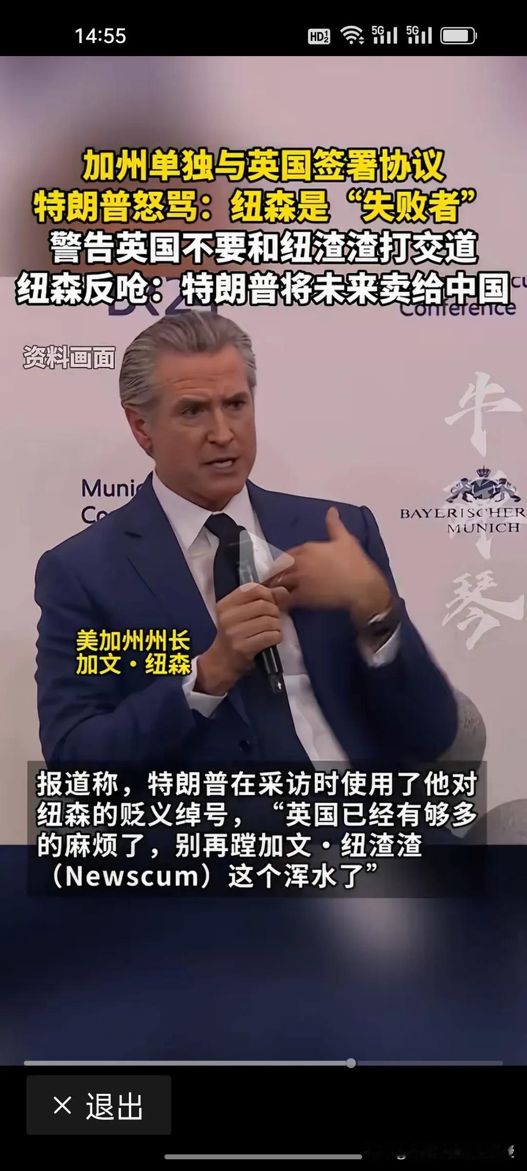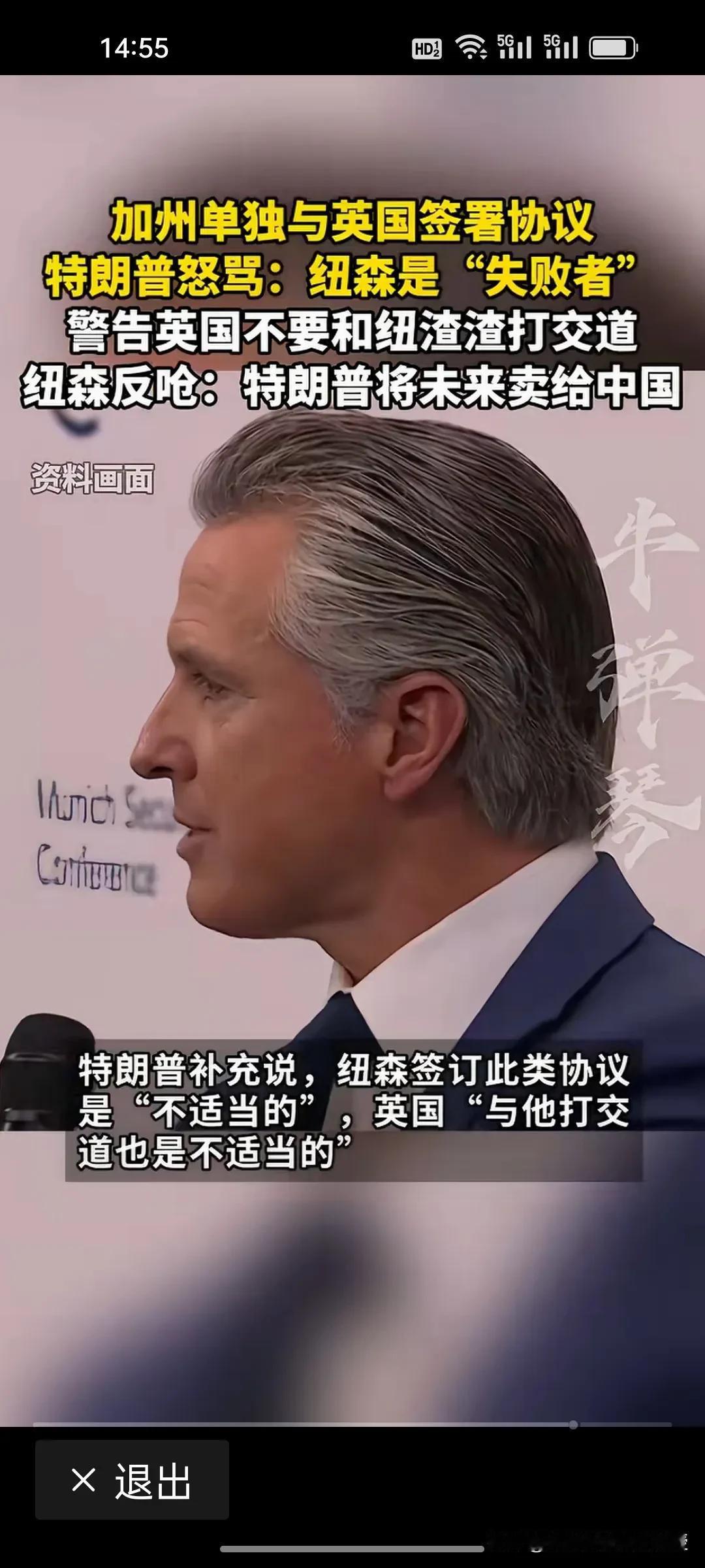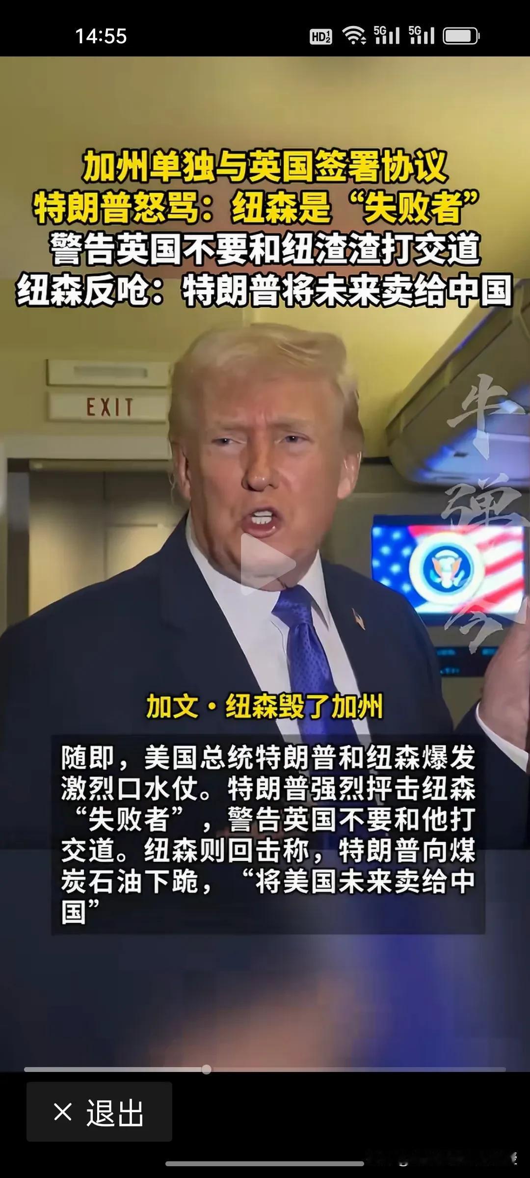 特朗普和纽森又掐起来了!加州“单飞”英国,特朗普破防骂街,为何又扯中国? 加州州长纽森绕开联邦,单独和英国签清洁能源协议,特朗普直接破防,骂他是“失败者”,还警告英国别和“纽渣渣”打交道。纽森也不示弱,反呛特朗普把美国未来卖给中国。 纽森为啥要“单飞”?本质是和特朗普的能源路线彻底决裂。特朗普力挺化石能源,而加州要靠清洁能源转型,在联邦层面受阻后,只能自己找国际伙伴破局。 特朗普骂街,是因为纽森的“越界”挑战了他的权威,也戳破了他“美国优先”的谎言。而两人吵架又扯上中国,不过是把中国当成了政治互殴的工具,用“卖未来给中国”这种话术互相抹黑。 美国的内斗,已经到了连对外合作都要互相拆台的地步,这出戏,到底是谁在真正输掉未来?