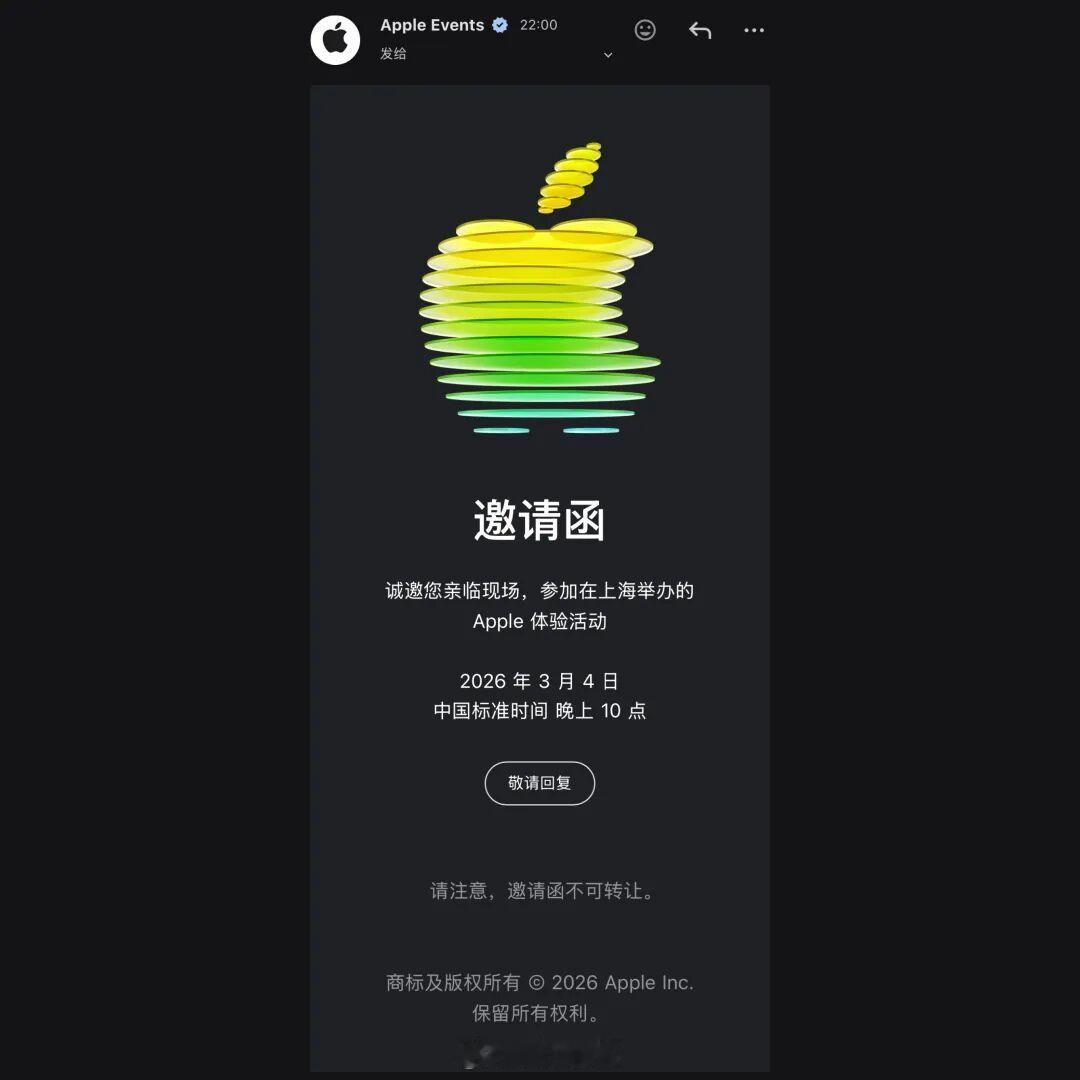 苹果突然官宣线下体验会苹果官宣将于 3 月 4 日晚 10 点举办 2026 年的首场发布会,具体来说有不少新品面世:iPhone 17e;使用 A18 处理器的无印 MacBook;M5 Pro/Max 款的 MacBook Pro;新一代 iPad Air 和无印 iPad;新版 Studio Display、Apple TV 和 HomePod mini
