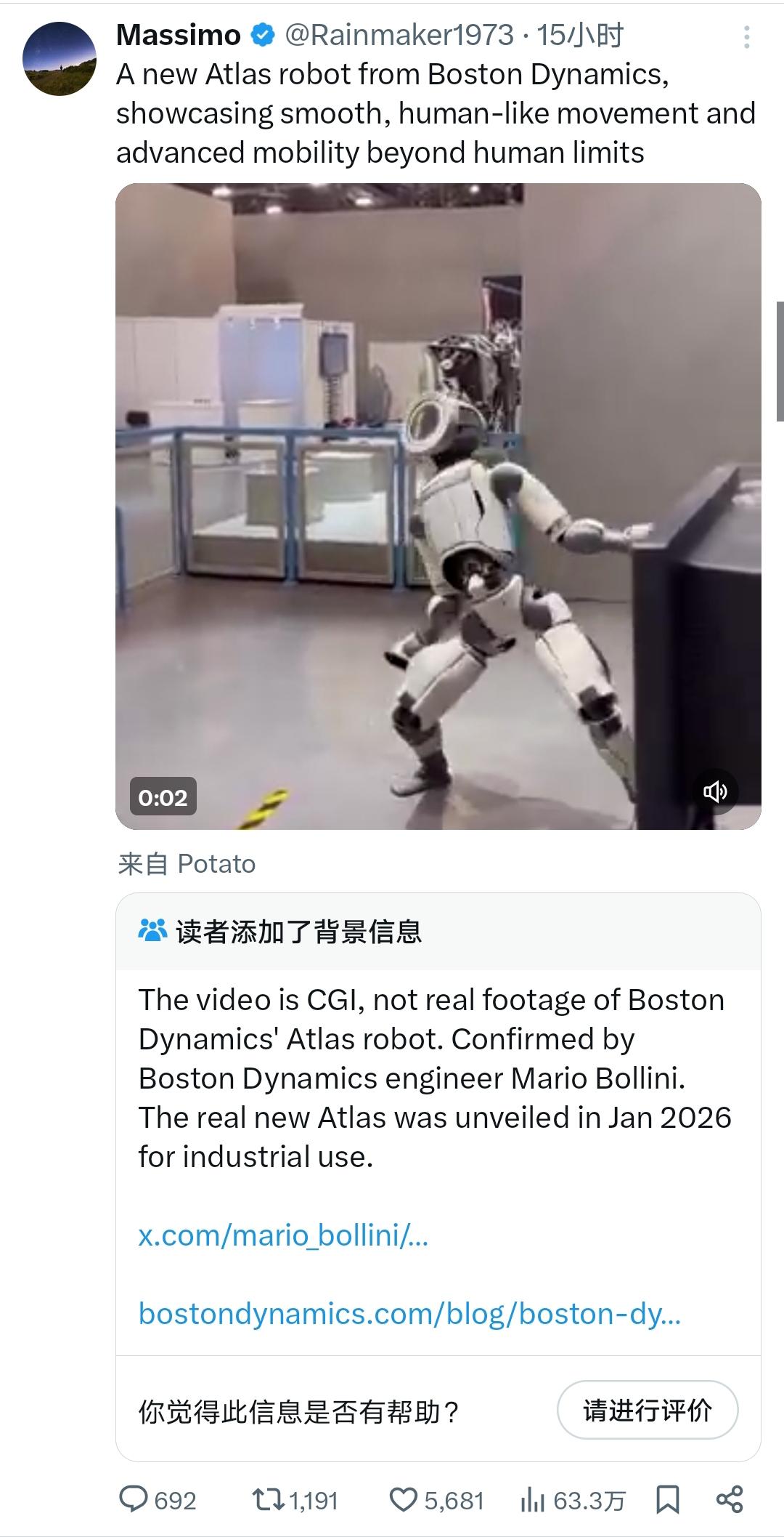 波士顿动力辟谣了:那视频是AI假的 春晚《武Bot》刚火,X上就被“波士顿动力Atlas跳舞”的视频刷屏了,还踩着印度神曲的节奏,那胯扭得,比真人还妖娆。 结果呢?波士顿动力的工程师亲自下场澄清:哦豁,这是AI生成的,不是真的。 巧了,之前不是有人说“宇树那点本事没什么了不起,西方不是做不出来,只是不屑于做”吗? 行吧。 那这波操作怎么解释——这边中国刚演完,那边就急吼吼用AI“补发”一段?不屑于做的人,通常不会这么着急证明自己“也能做”。 更耐人寻味的是,波士顿动力今年1月刚发布的真·新款Atlas,主打的明明是“工业实用场景”——稳重、干活、别整那些花里胡哨的。 可那条AI视频偏不,偏要让它跳舞、扭胯、玩花活。 大概是因为,他们发现中国机器人“既能干活又会整活”,才是最让人破防的。 中国机器人是不是真领先?不看广告,看对手的“应激反应”。 可这是在打谁的脸呐?? Source: X