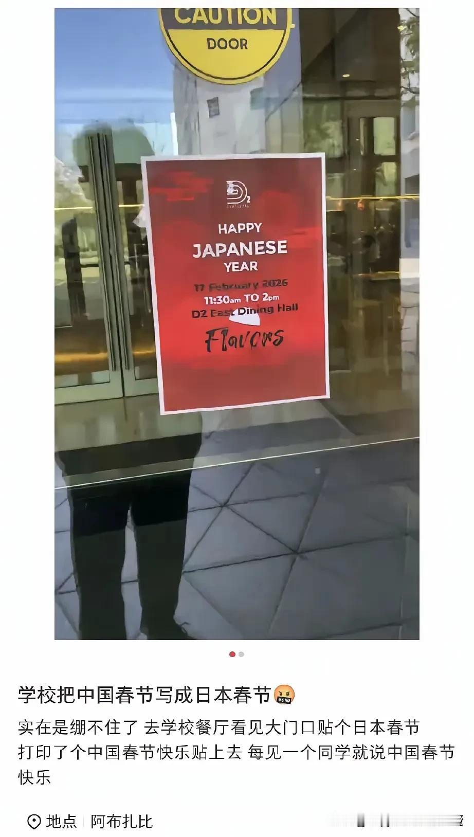 这位留学阿布扎比的中国学生的做法,为何让无数网友破防? 阿布扎比一所大学餐厅,竟将中国春节错标成“日本春节”。一名中国留学生没有沉默,当即打印“Happy Chinese New Year”海报贴上,还逢人就说“中国春节快乐”。 这不是小题大做,而是文化主权的坚守。春节是刻在中国人血脉里的文化符号,容不得半点混淆。那位贴着“日本春节”海报的人不知道是不是故意为之,这位留学生的举动,温柔却有力量,用行动厘清文化边界,守护民族根脉。 少年强则国强,身在海外,他就是中国文化的微光。为这位挺身而出的留学生,狠狠点个赞![赞]