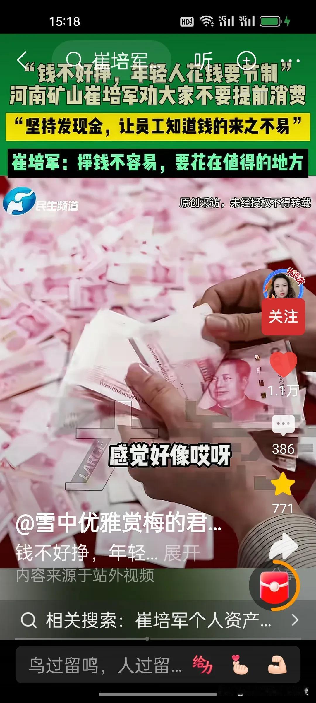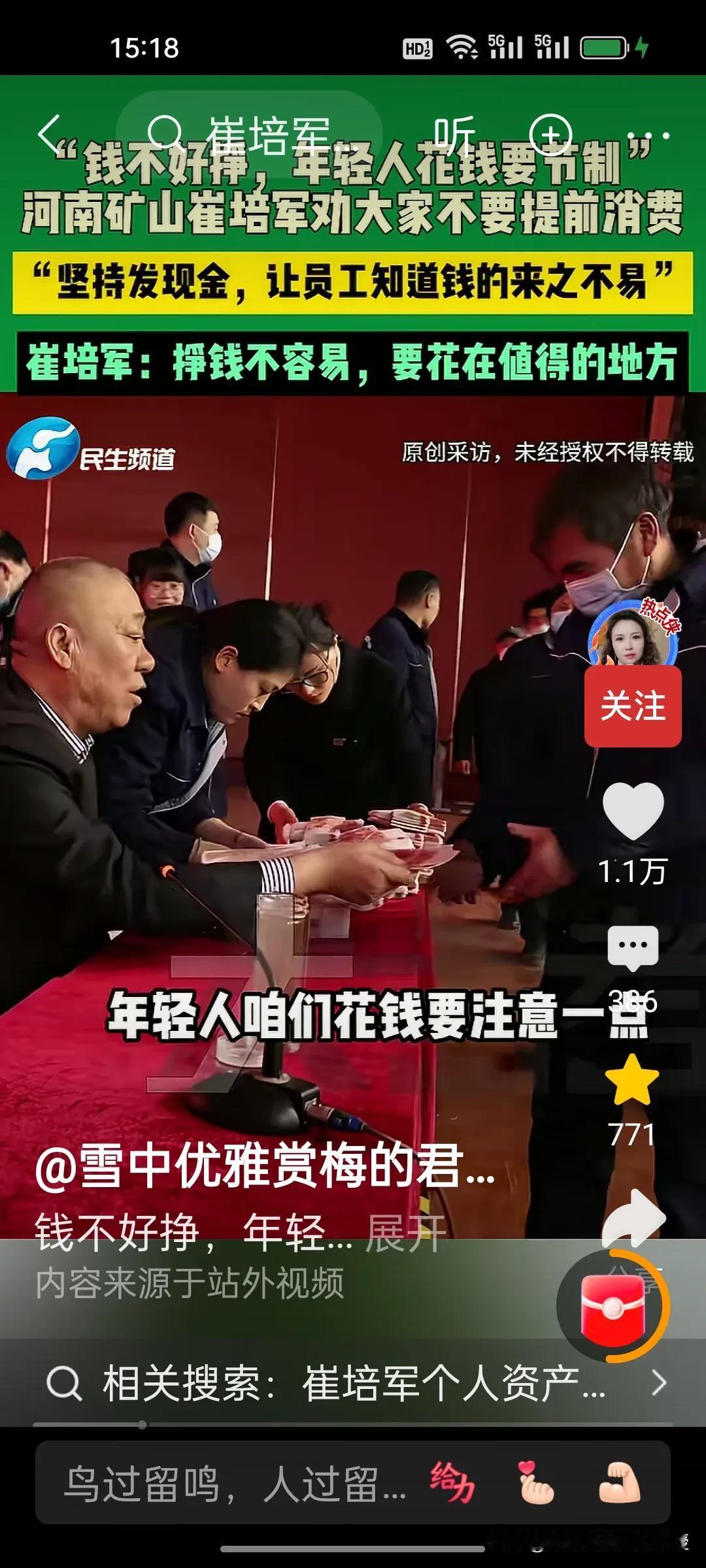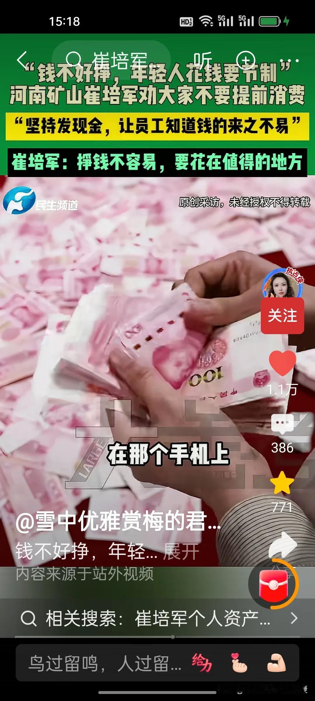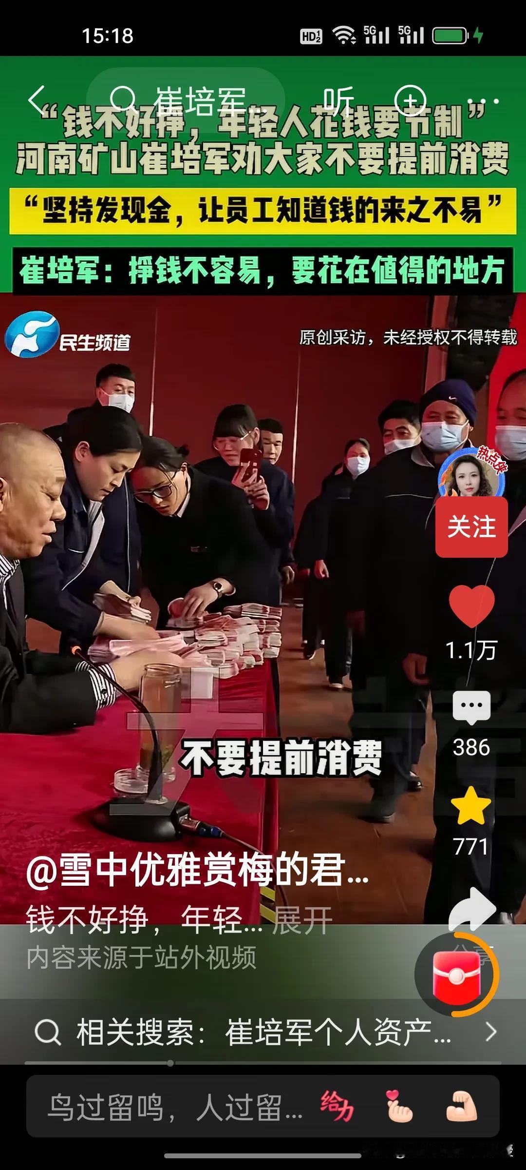 为什么崔培军坚持每年年会上发现金?答案戳中了所有年轻人的痛点! 河南矿山老板崔培军,每年年会都给员工发现金,一沓沓红钞票堆在桌上,员工亲手接过。这是让员工觉得企业有钱吗?崔培军道出了真相:“钱在手机上一扫,感觉不是钱;坚持发现金,让员工知道钱来之不易,要花在值得的地方。” 这句话,戳中了多少人的消费痛点?数字支付让我们对钱的感知变弱,花呗、信用卡让提前消费变得理所当然,而现金的厚重感,能让我们重新意识到:每一分钱,都是汗水换来的。 崔培军的做法,不仅是发福利,更是在给员工上一堂财商课。当我们亲手触摸到纸币的温度,才会真正懂得节制和珍惜。