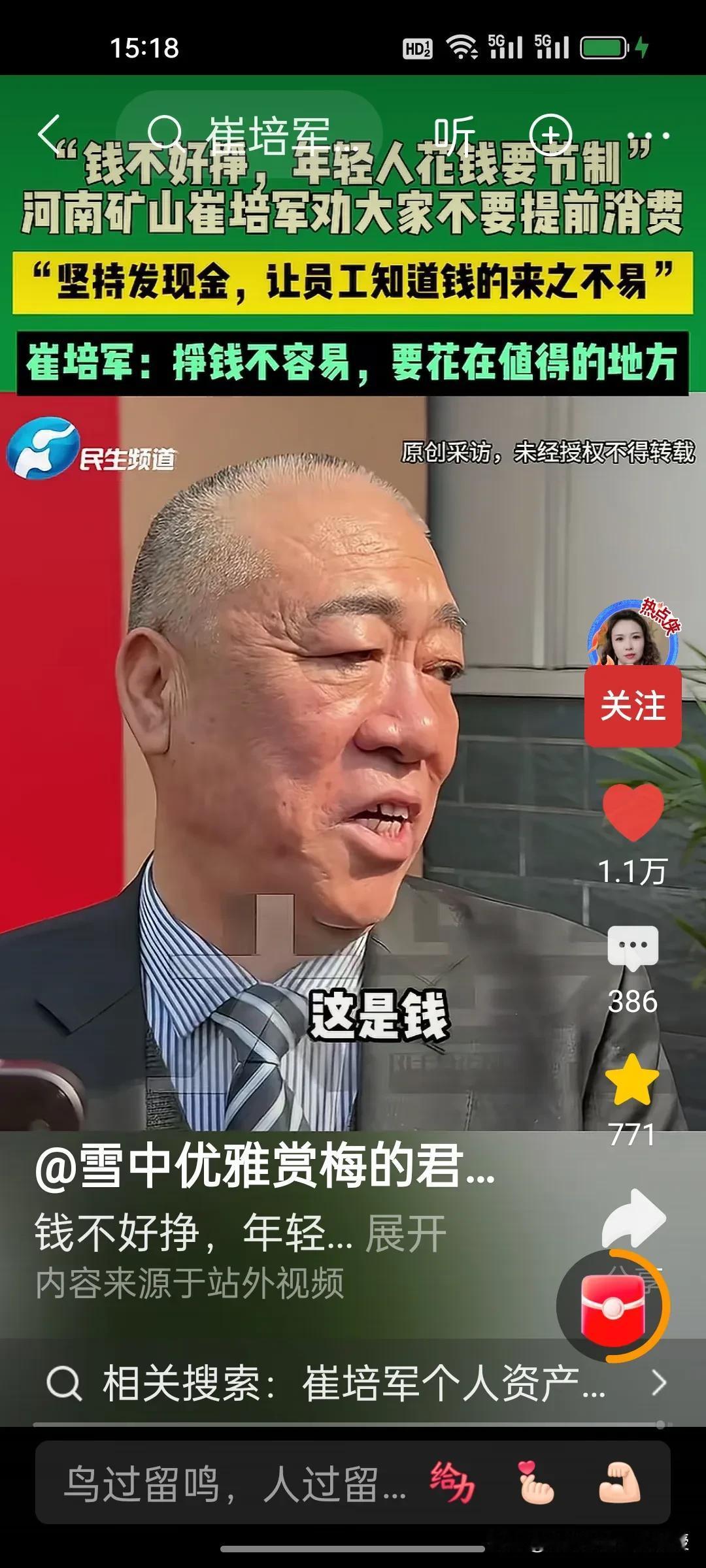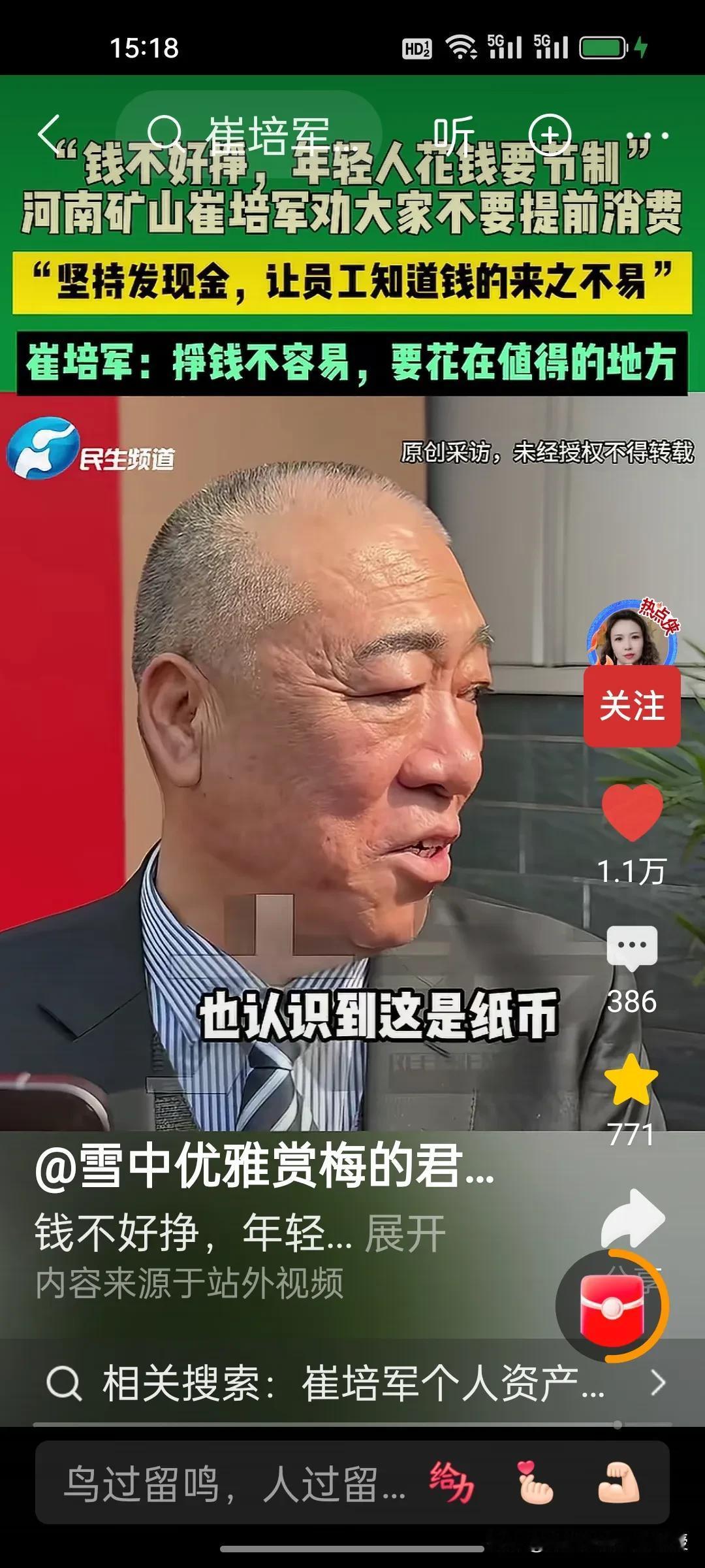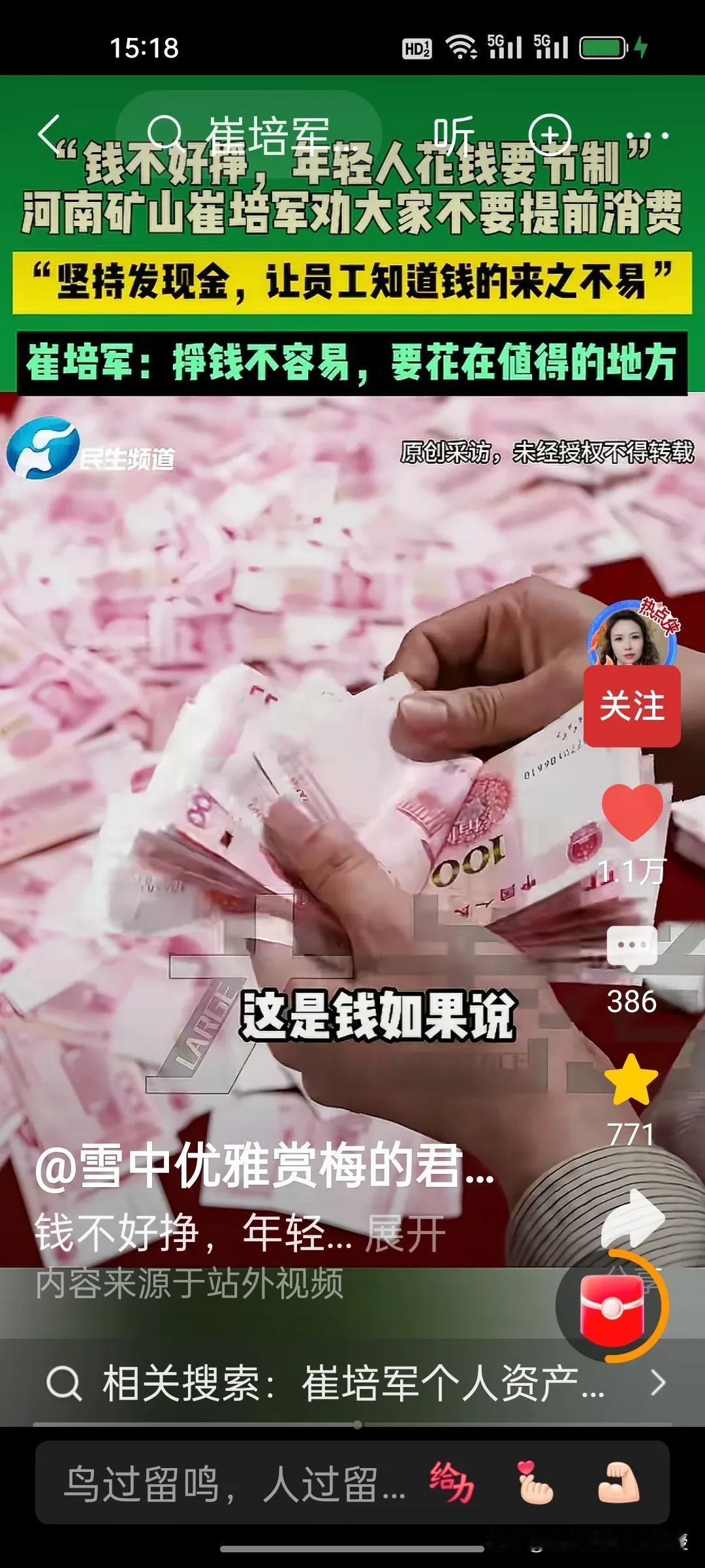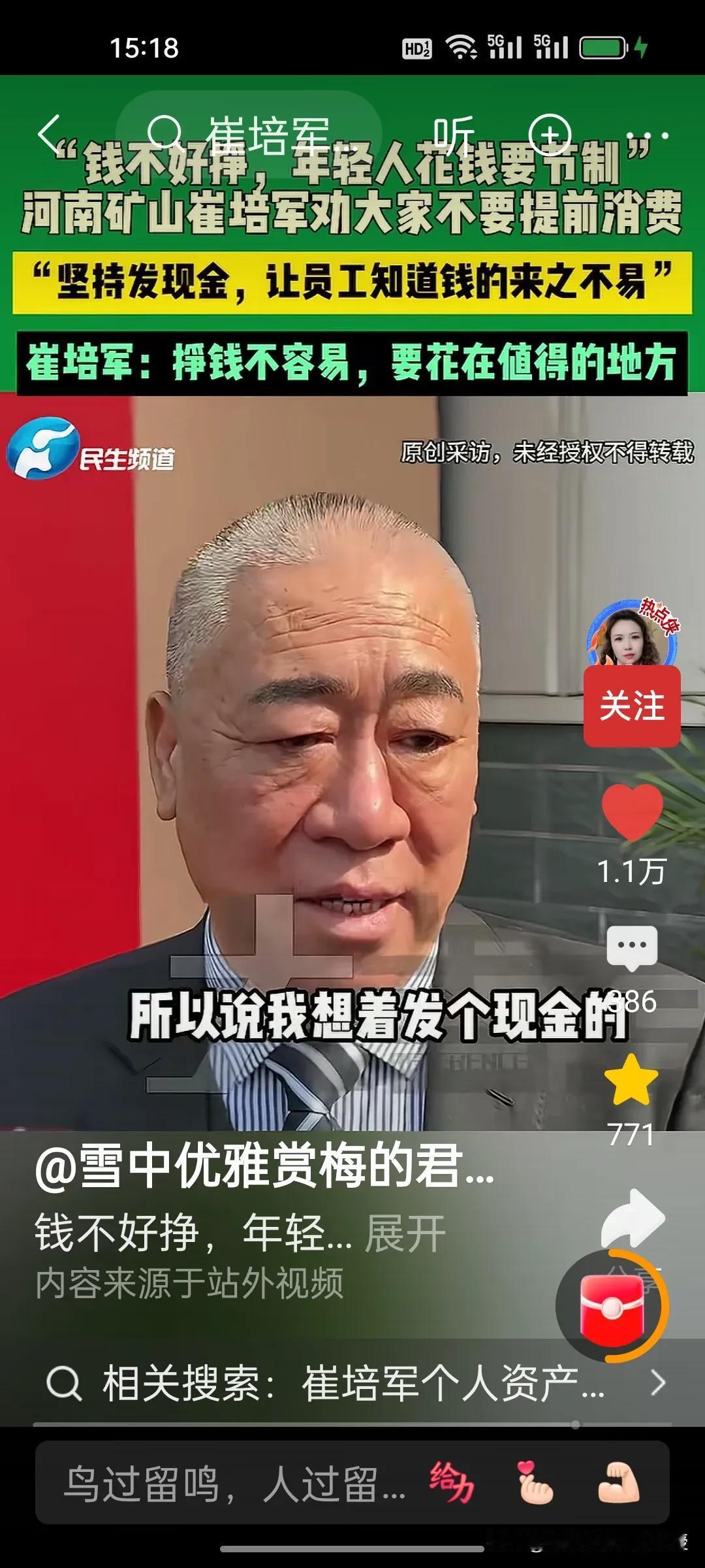 为什么崔培军坚持每年年会上发现金?答案戳中了所有年轻人的痛点! 河南矿山老板崔培军,每年年会都给员工发现金,一沓沓红钞票堆在桌上,员工亲手接过。这是让员工觉得企业有钱吗?崔培军道出了真相:“钱在手机上一扫,感觉不是钱;坚持发现金,让员工知道钱来之不易,要花在值得的地方。” 这句话,戳中了多少人的消费痛点?数字支付让我们对钱的感知变弱,花呗、信用卡让提前消费变得理所当然,而现金的厚重感,能让我们重新意识到:每一分钱,都是汗水换来的。 崔培军的做法,不仅是发福利,更是在给员工上一堂财商课。当我们亲手触摸到纸币的温度,才会真正懂得节制和珍惜。