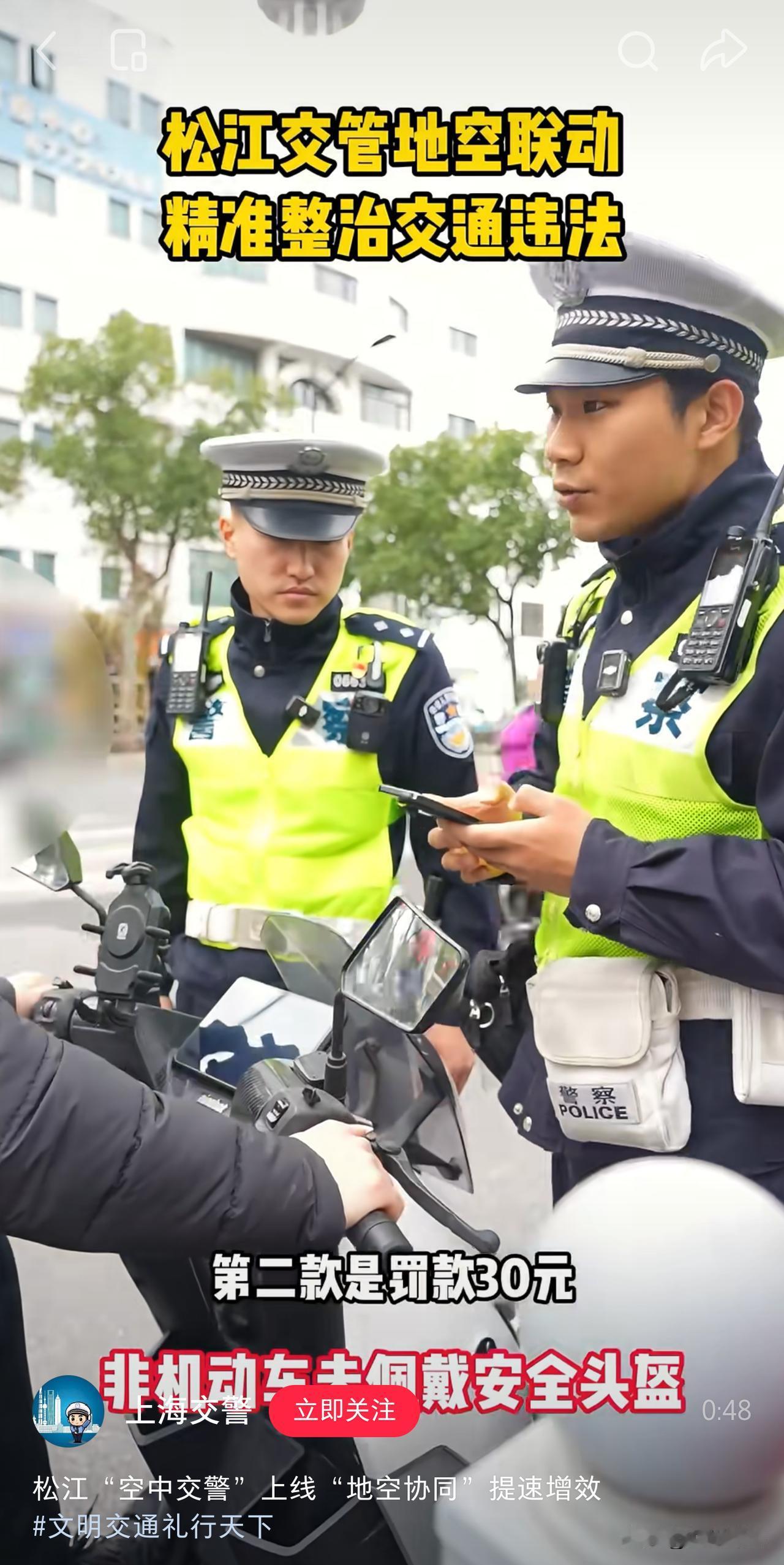 新思路,新战线,新常态!上海“空中交警”上线,“空地协同作战”,让交通违法无处遁形!机动车、电动车、行人都尽在掌握! 小汽车人行横道不礼让行人,电动自行车骑乘人员不戴头盔,行人不走斑马线过马路都是常见的交通不文明行为。 上海虽然是全国经济实力最强的城市,但上海的交通违法处罚标准还是比较低的,至少比广东要低。 广东不礼让行人是扣三分,罚款200元,上海只罚款100元,还是比较低的。 电动自行车驾乘人员不戴头盔,广东是罚款50元,上海只有30,比广东也低不少。 不过通过无人机执法,很难实现全天候24小时在线,毕竟需要一直在天上飞行才行。 只是作为路面和电子眼的补充存在,在关键时间段增加效率。 当然了,作为交通参与者,无论是机动车,还是非机动车,或者行人,还是要严格遵守交通规则的好,安全最重要!