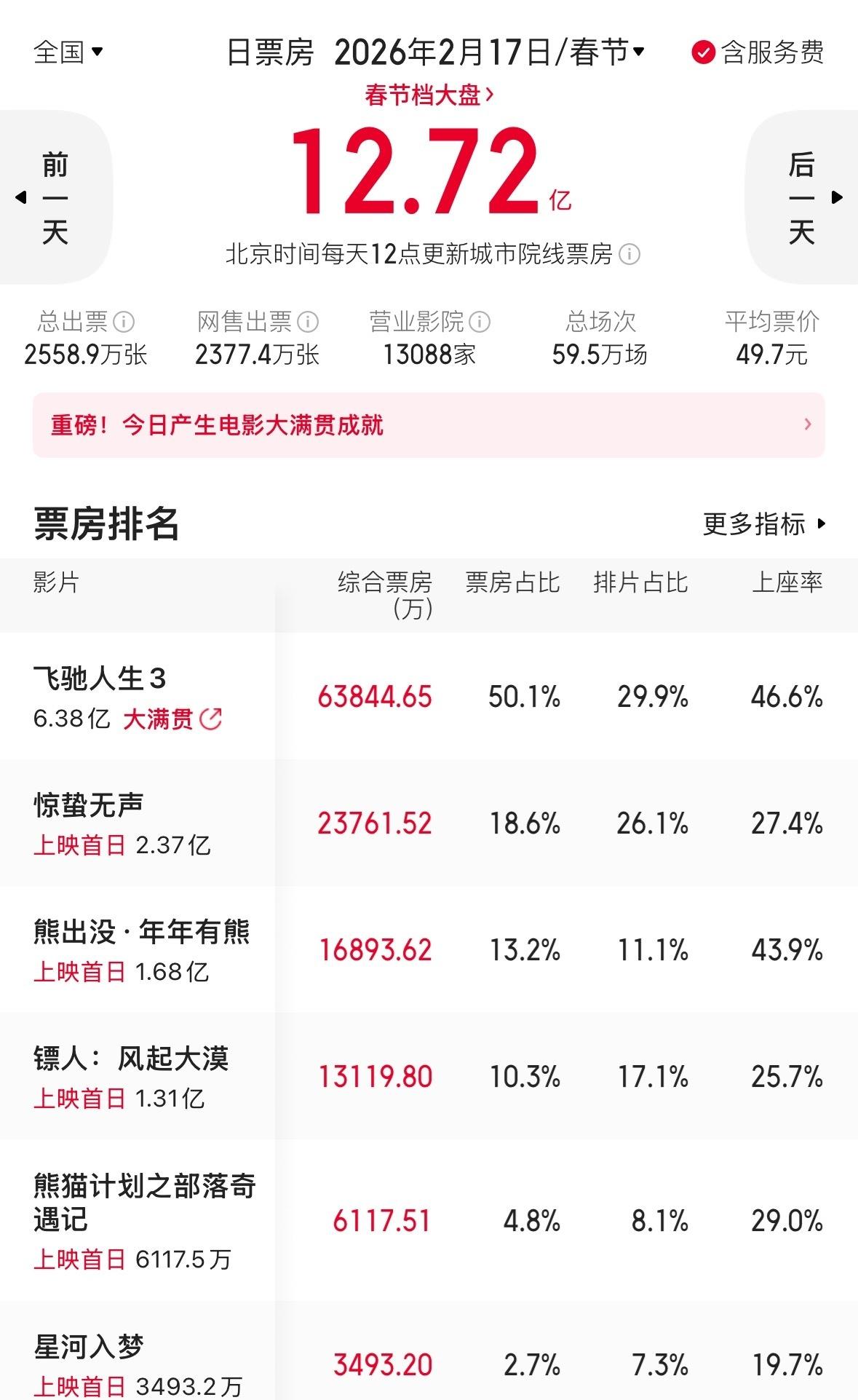 炸了!飞驰3狂揽7.49亿,预测直冲50亿!甘孜彻底火出圈 2026春节档杀疯了!大年初一票房直接破15.5亿,《飞驰人生3》一骑绝尘,狂揽7.49亿断层第一,猫眼预测票房有望超50亿,妥妥的年度爆款预定! 沈腾一出场,票房稳一半!喜剧+赛车+热血情怀,全程笑中带泪,高原实景拍摄太震撼,不光电影好看,还把四川甘孜带火了!绝美公路、高原秘境,看完电影谁不想去甘孜飙一圈、打卡同款风景? 今年春节档竞争超激烈,《惊蛰无声》《熊出没》《镖人》个个能打,但飞驰3依旧稳坐冠军宝座,口碑票房双丰收,不愧是全民都爱的系列。 过年不看一场春节档,总觉得少点年味。大年初一就这么猛,后面几天票房肯定还要暴涨! 你去看《飞驰人生3》了吗?最喜欢哪个片段?会不会去甘孜打卡?评论区聊聊! 飞驰人生3票房超50亿 飞驰人生3带火甘孜