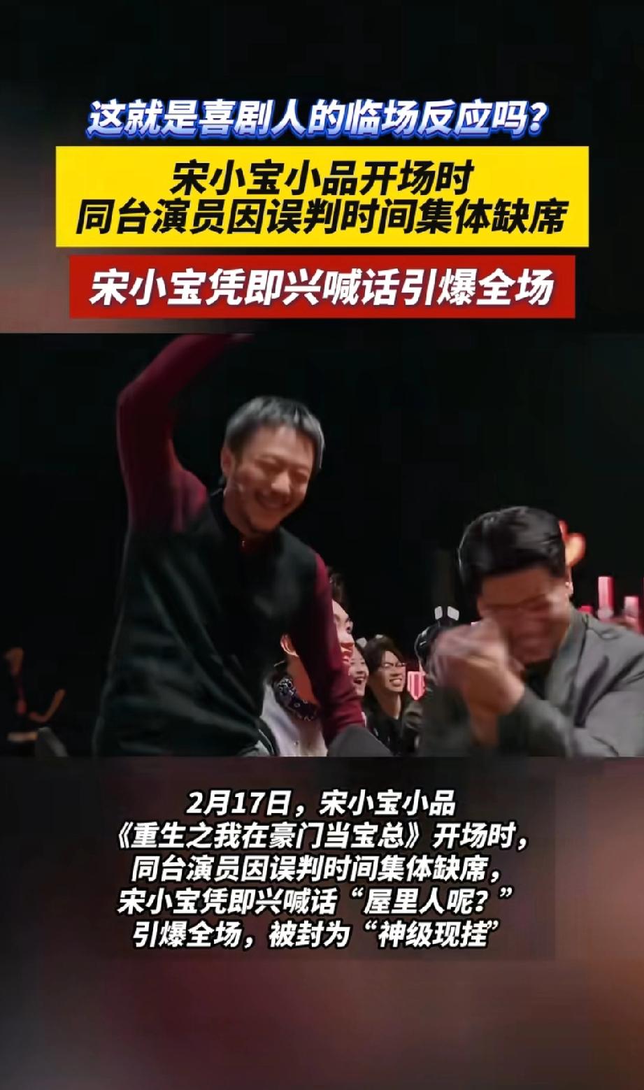 宋小宝这次春晚真的太好笑了! 灯光没跟上,搭档还在外面等着,就他一个人在台上,他直接喊了一句:屋里人呢? 全场直接爆笑~ 其实这种小意外根本不算翻车,反而觉得特真实、接地气。 就跟咱们小时候上学,开联欢会一样,即兴发挥、热热闹闹,气氛反而更好。 春晚就缺这种松弛感,只要不是大错,观众都能接受。 宋小宝