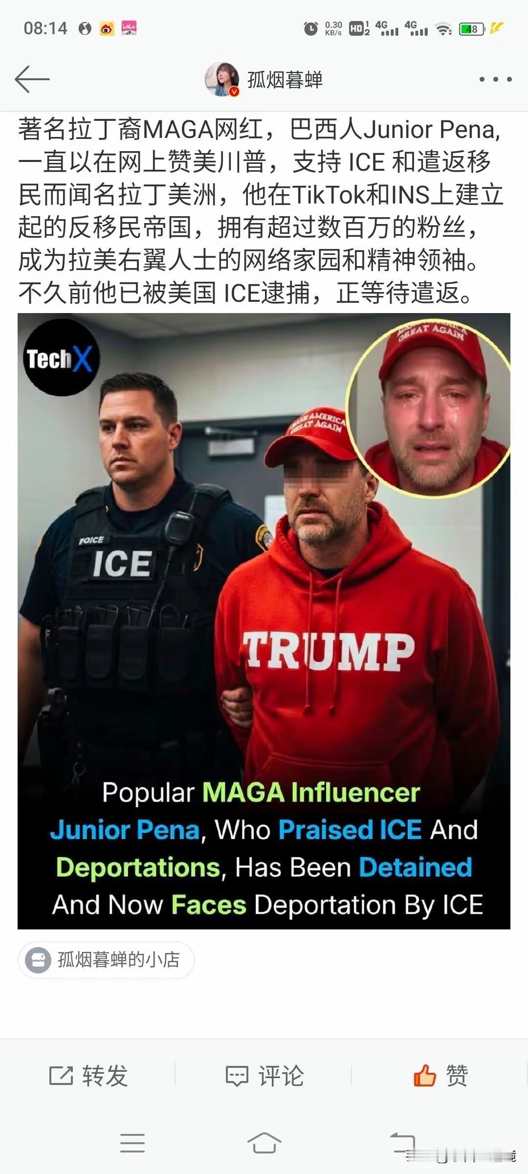 特朗普干得漂亮😂 美国红脖子领头人物,著名网红巴西裔Junior Pena一直在网上盛赞川普,支持川普的一切政治政策,包括ICE和遣返移民。日前已被ICE逮捕,正在等待遣返回巴西。求锤得锤?至少川普政策确实做到无差别打击,有移民他是真遣返啊。 这事儿简直比好莱坞编剧写的剧本还黑色幽默。Pena老哥在网上骂非法移民骂得嗓子都哑了,天天喊着“America First”,结果自己就是那个要被“First”送走的。他视频里那股子红脖子的狠劲儿,那些对着镜头挥舞国旗的激情,现在看来,像极了一场精心排练却记错了舞台的独角戏。 说实话,Pena这回算是用自己的亲身经历,给所有支持者上了一堂代价高昂的“法律普及课”。美国移民局那帮人干活,什么时候看过你的YouTube粉丝数和点赞量?他们在电脑里只查两样东西:姓名和入境记录。Pena的巴西护照,可比他嘴里的“我们美国人”要真实得多,也刺眼得多。 很多人忽略了这场闹剧里最残酷的那层底色。Pena为了融入他想象中的“铁杆美国群体”,必须把自己变成一个比美国人还要美国的激进派。他要用最狠的言辞,来表达对“新家园”的忠诚。这种急于表忠心的心态,让他忘了,在真正的法律条文面前,他那个移民身份,就是一道永远无法抹去的原罪。 更有意思的是,Pena被捕后,那些曾经在他视频底下喊着“兄弟挺你”的铁粉,瞬间就安静了。网络世界的同温层,暖洋洋的,让人产生一种“大家都是自己人”的幻觉。可一旦现实的风雨砸下来,这个泡沫啪地就碎了。没人能替他给ICE打电话,也没人能替他搞定那张绿卡。 他崇拜的那个强人政治,执行起政策来,确实是六亲不认,铁面无私。川普团队要的就是这种震慑效果,要的就是让所有非法移民,不管你屁股坐在哪边,不管你的嗓门为谁呐喊,都得瑟瑟发抖。Pena以为自己是个猎人,举着枪在帮主人驱赶猎物,最后才发现,在主人眼里,他自己就是那头最合适的猎物。 这出荒诞剧演到这儿,留下的是一地鸡毛和满屏的嘲讽。Pena可能到现在都想不通,为什么自己那么卖力地表演忠诚,最后换来的却是一张遣返的单程机票。他或许终于明白,政治立场这种东西,在冷冰冰的出生地和国籍面前,有时候真的连个屁都不如。 各位读者你们怎么看?欢迎在评论区讨论。