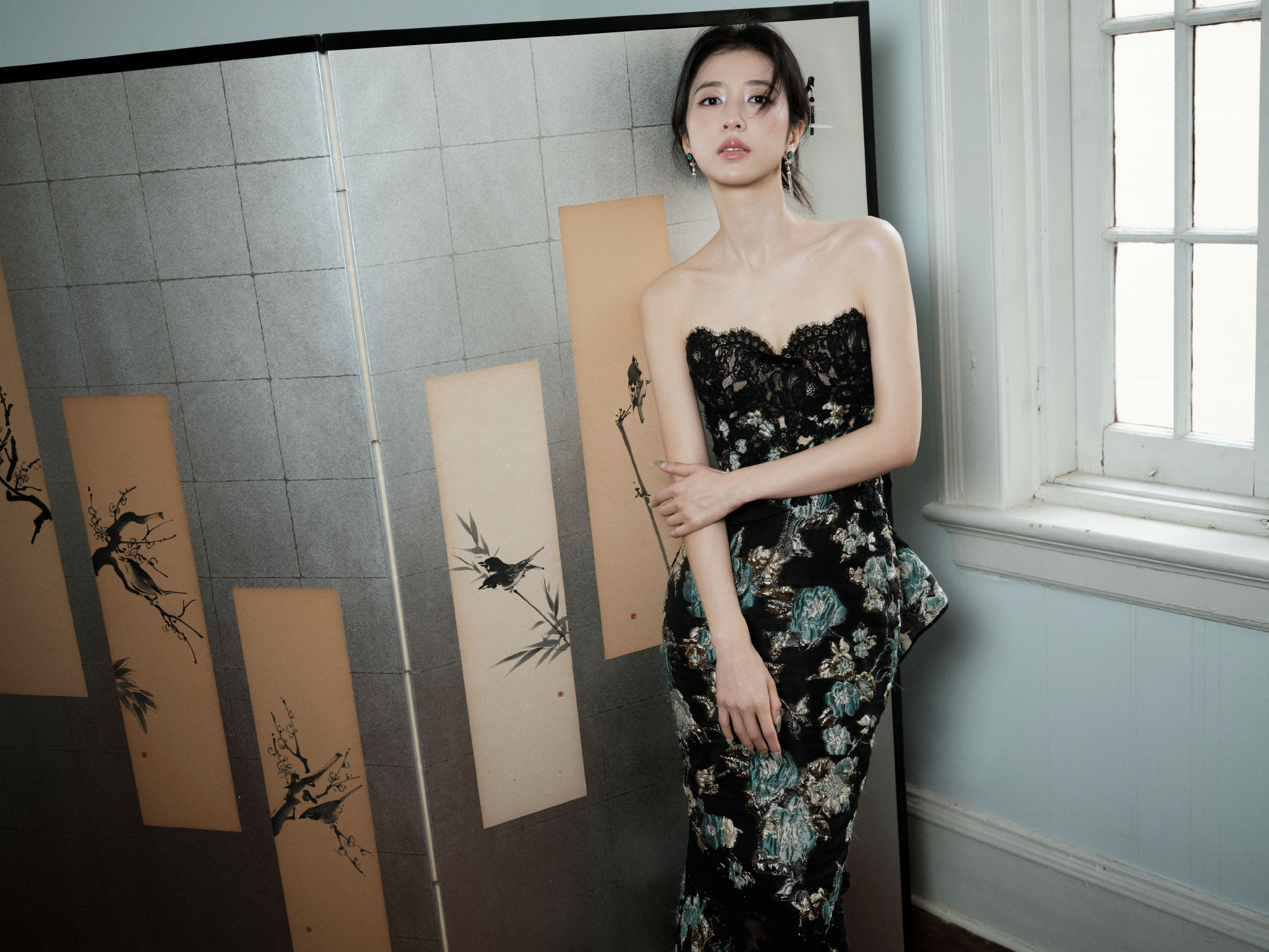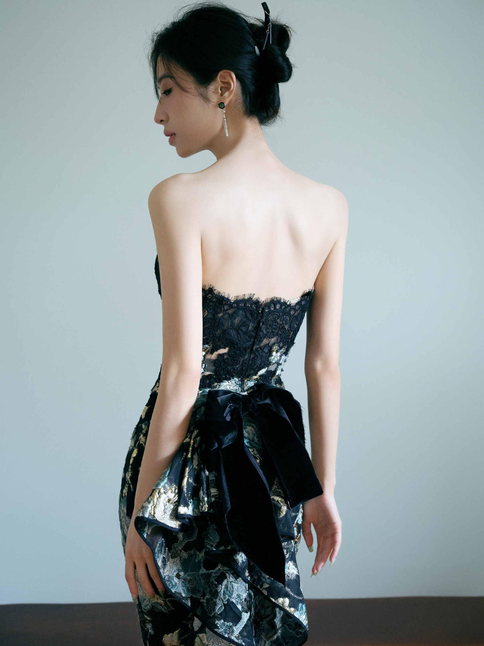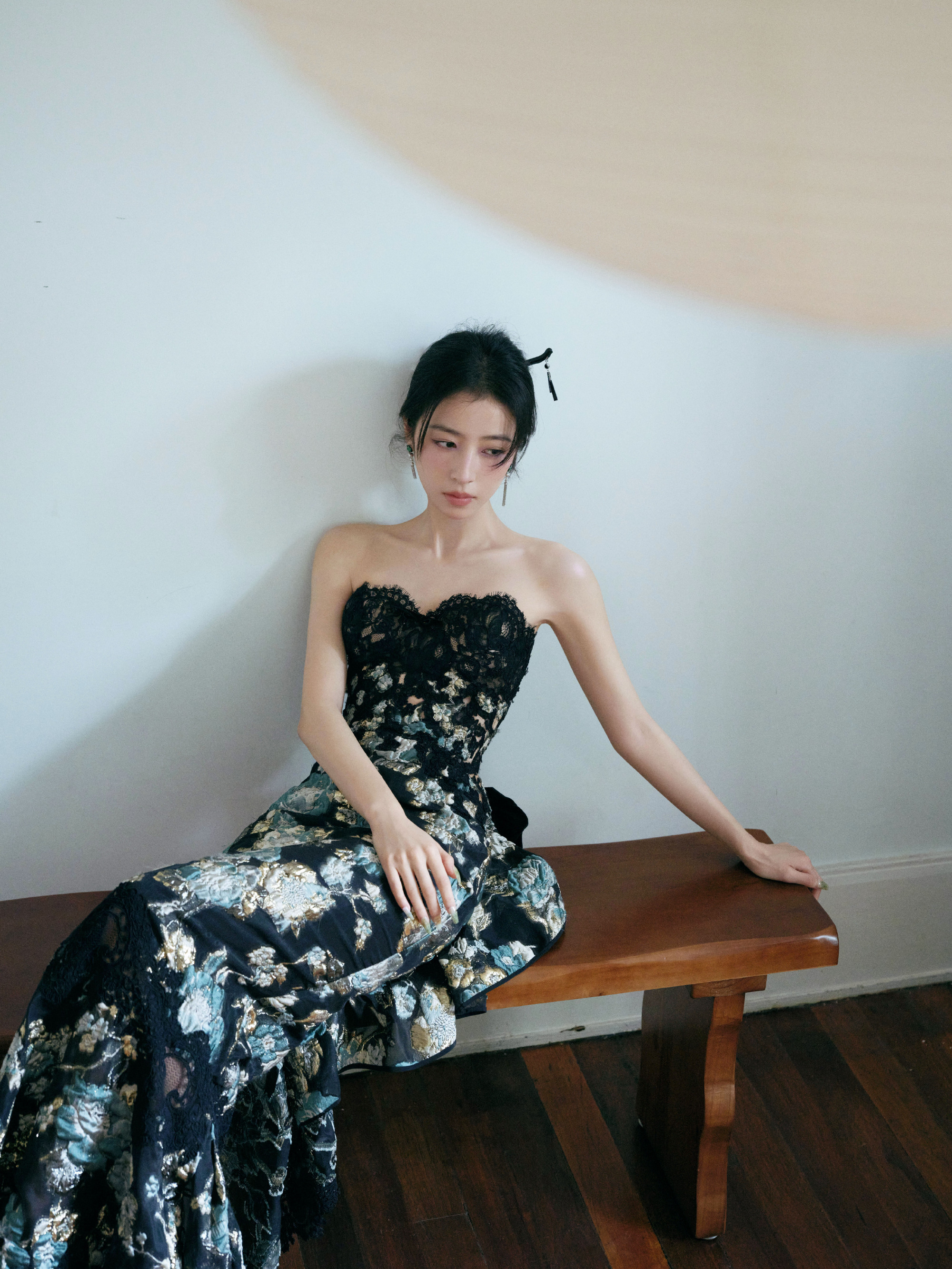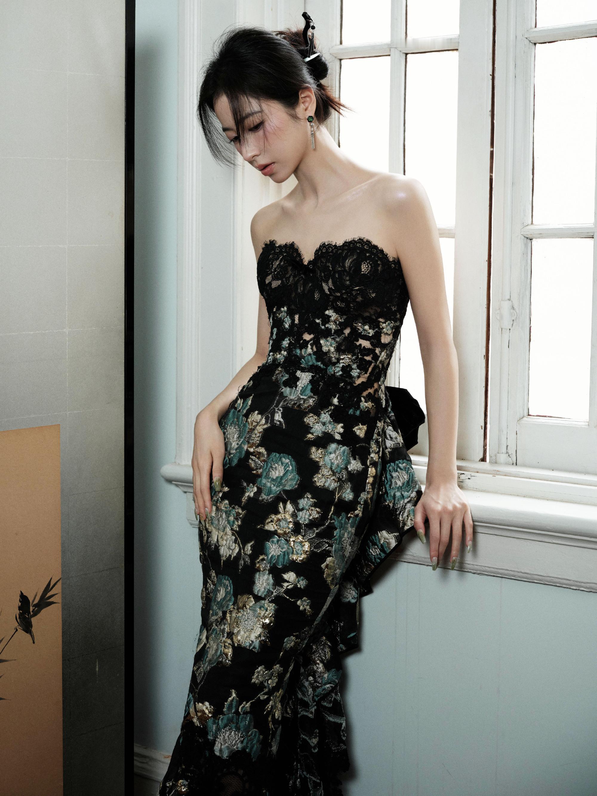 周雨彤,黑染绣花抹胸裙,优雅明艳。周雨彤