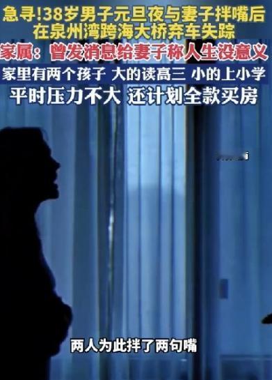 压倒骆驼的最后一根稻草!福建泉州,一38岁男子回到家里,立刻就想上床休息,谁知被妻子拦住,要他先洗脚再上床,为了这点小事,俩人发生了吵架,男子一气之下,开车来到了跨海大桥,他打开双闪,将车停在应急车道,他给妻子发了条消息:“人生没有意义!”又给妻子妹妹发了条消息:“妻子就交给你照顾了!”妻子急了,赶忙给他回拨电话,可电话无人接听,警方赶到了现场,发现男子手机等随身物品都放在车里,人却不见了踪迹。 福建泉州,38岁的林志强(化名)每天早上六点起床,打开窗户,空气里带着淡淡的海盐味,他会先在厨房里给家人准备早餐。 大儿子喜欢吃豆浆配油条,小儿子更爱煎蛋和稀饭,每次看到孩子们狼吞虎咽的样子,他总会心里有些满足感。 家里的生活节奏井然有序,林志强早早出门上班,开着那辆老旧的本田轿车,沿着城市的主干道驶向工厂。 他在厂里当技术员,工作不算轻松,但同事关系融洽,领导对他也算器重。 回到家后,他喜欢坐在阳台上抽根烟,偶尔和妻子聊聊家里的琐事。生活虽然平凡,但他自觉算得上安稳。每个月按时交房贷、水电费,孩子的学费、生活费都安排妥当。 偶尔工厂加班,他也会牺牲自己的休息时间,只为了家里少些负担。 他没什么奢望,买得起一家人需要的生活用品就心满意足,周末吃顿海鲜,或者全家一起去超市采购,都能让他感到小小的幸福。 林志强知道自己的生活可能不会有什么大起大落,也不需要轰轰烈烈的精彩,只要家人平安,孩子健康,他觉得自己的人生已经算是“过得去”。 他常常在心里告诉自己,这样平凡而充实的日子,也是一种值得珍惜的幸福。 元旦那天,他加了一整天班。夜色压下来时,人已经累到发木。回到家,鞋还没脱利索,脑袋里就只有一个念头:倒头睡一觉。 可他刚往床边走,妻子在身后喊住了他:“先洗脚再上床。” 这句话在平时也许不算什么,可那天晚上,像一根细小却锋利的刺,扎进了他绷了一整天的神经。 “我这么累了,洗不洗脚有什么关系?”他语气里带着压抑不住的烦躁。 妻子也不让步:“不洗脚就别上床,床单刚换的。” 一句话顶一句话,情绪迅速失控。那些平日里没来得及说出口的委屈、疲惫、不被理解,在那一刻全部翻涌出来。 林志强觉得自己像个不停旋转的陀螺,挣钱、养家、撑着笑脸,可在家里,连“累”都不被允许。 争吵越演越烈,孩子在房间里不敢出声。最终,他甩下一句:“行,我走。”转身出了门。 夜风冷得刺骨。他坐进车里,没有目的地,只是顺着路一直开。跨海大桥的灯在黑暗里一盏盏拉开,海面翻着白光,像无边的空洞。 他把车停在应急车道,打开双闪。车内很安静,静得只剩下自己的呼吸声。那一刻,他忽然觉得,自己的人生好像被一只无形的手按了暂停键——没有人真正需要他的存在。 他给妻子发了一条消息:“人生没有意义。” 又给妻子的妹妹发了一条:“我不在了,姐姐就交给你照顾了。” 发完后,他把手机放在副驾驶,靠在座椅上,盯着远处的桥灯发了很久的呆。 家里,妻子看到消息,整个人都慌了。她反复回拨电话,听筒里却只有冰冷的提示音。她这才意识到,刚才那场争吵,可能不是简单的拌嘴。 警方接警后迅速赶到跨海大桥。夜色里,警灯闪烁,桥面被照得忽明忽暗。林志强的车停在路边,双闪还亮着,车门紧闭,车内整齐——手机、钱包、钥匙,全都放在座位上。 唯独人不见了。 海风呼啸,浪声拍打桥墩,像一下一下敲在人心上。搜寻持续到深夜,家属在桥头哭得站不住脚。妻子不停地自责:“就为了洗脚,我为什么要跟他吵……” 这件事很快在当地传开,许多人唏嘘不已。一个看似平稳的中年男人,两个孩子,一个完整的家,却在一次再普通不过的争执中,被压垮了最后一根神经。 生活里,真正让人崩溃的,往往不是惊天动地的大事,而是那些被忽视的疲惫、被否定的付出、被一句句小事推到角落的情绪。 如果那天,有人先停下来,给他一句“你先歇会儿”;如果那一刻,他能被真正听见,也许结局就不会走到这一步。