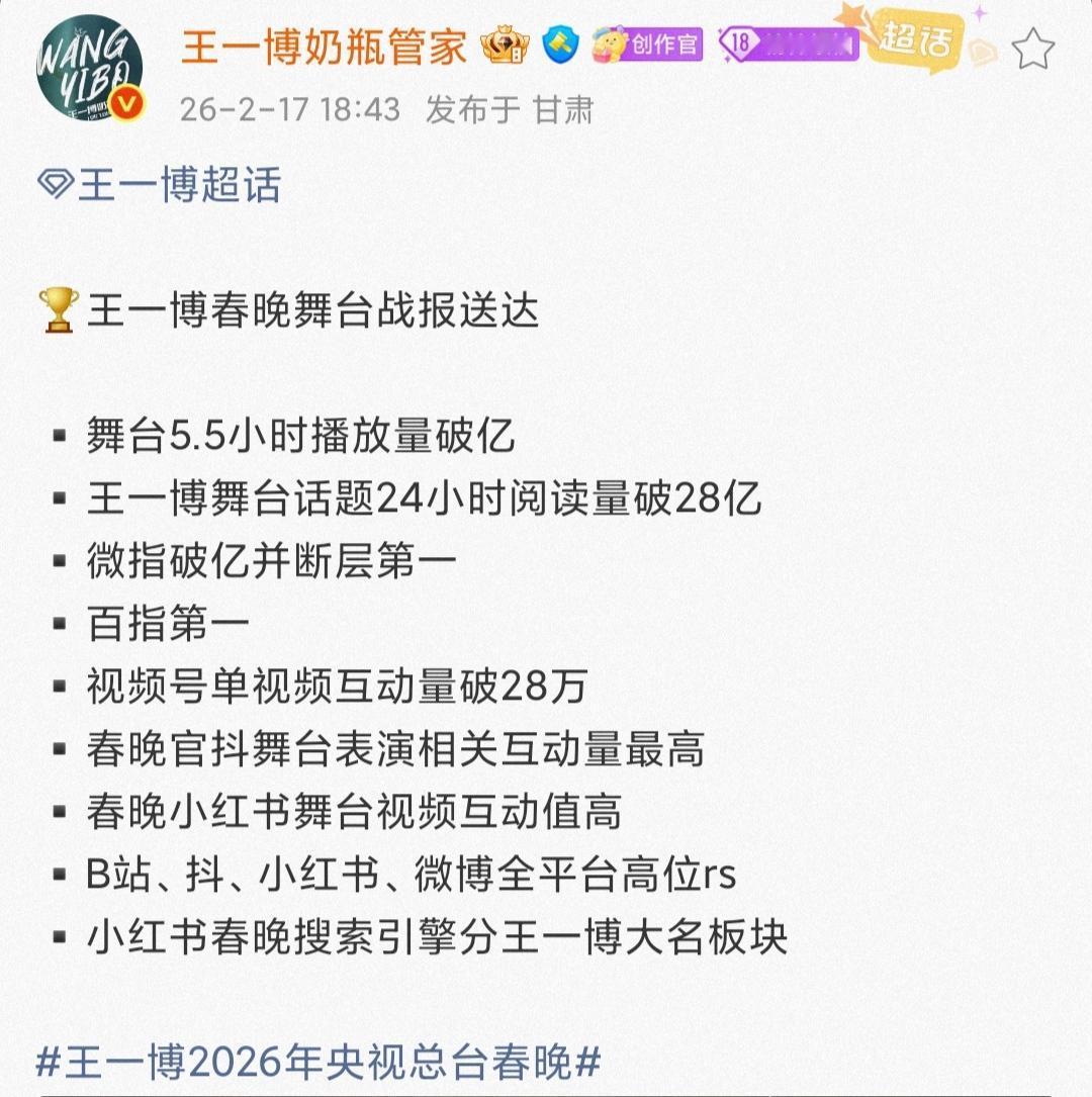 牛逼!舞台,就是王一博的统治区,王者登场,无人匹敌! 🏆王一博春晚舞台战报送达 ▪️舞台5.5小时播放量破亿 ▪️王一博舞台话题24小时阅读量破28亿 ▪️微指破亿并断层第一 ▪️百指第一 ▪️视频号单视频互动量破28万 ▪️春晚官抖舞台表演相关互动量最高 ▪️春晚小红书舞台视频互动值高 ▪️B站、抖、小红书、微博全平台高位rs ▪️小红书春晚搜索引擎分王一博大名板块 王一博
