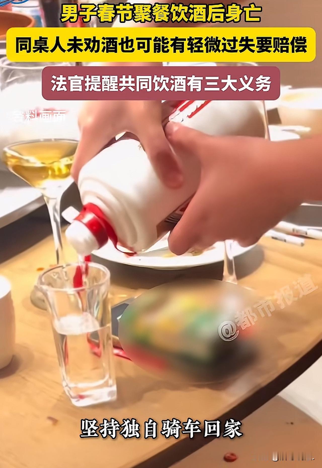 湖北荆州,53岁男子在朋友的陪同下,去另外一朋友家拜年,席间,主人询问男子和朋友是否喝点酒,二人并未反对,主人为男子倒了一两白酒,为另一朋友倒了2两白酒,其余人并未饮酒,也并无劝酒行为,饭局结束后,又一起玩了一会牌。牌局结束后,男子坚持自己骑电动车回家,其他人并未强行劝阻。谁知,男子回到家后,突然感觉到身体不适,家人赶紧将其去医院。结果抢救无效死亡,医生确诊为为脑干梗死、急性酒精中毒。家属悲痛欲绝,将男子朋友,以及设宴主人一并告上法庭。法院的判决很意外! 2025年2月,正是家家户户团圆过年的好日子,走亲访友、聚餐吃饭本是再平常不过的开心事,可谁也没想到,一场普通的拜年聚餐,却酿成了无法挽回的悲剧。 53岁的龙某,在朋友朱某某的陪同下,一起到杨某某家中拜年聚餐。 主人杨某某见老友上门,心里十分高兴,连忙张罗着买菜做饭,很快就备好了一桌子丰盛的饭菜,还拿出了自己珍藏的散装白酒。 席间,杨某某询问大家要不要小酌两杯助兴,龙某和杨某德也没有推辞,都说少喝一点热闹热闹。 杨某某便给龙某倒了约一两白酒,给杨某德倒了二两,桌上其他人都没有喝酒,全程也没有任何人劝酒、拼酒,大家喝完杯中酒,便很自然地结束了用餐。 饭后,杨某某、杨某德、龙某和熊某某四人还一起坐下来打牌娱乐,当时龙某的状态一切正常,看不出任何不适。 等到牌局结束,天色已经很晚,同行的人都担心龙某喝了酒骑车不安全,提出要送他回家,可龙某执意要自己驾驶电动三轮车回去,任凭大家怎么劝说都不肯接受。 众人见他态度坚决,加上觉得他只喝了少量酒应该不会有问题,便没有再坚持,任由他独自离开了。 可意外来得猝不及防,当天晚上21点左右,龙某突然身体严重不适,被紧急送往医院后,诊断为脑干梗死、急性酒精中毒。 尽管医院全力抢救,龙某还是在次日凌晨不幸离世。 家属悲痛欲绝,难以接受这个事实,认为发生这样的意外,朱某和杨某某都有不可推卸的责任,于是,一纸诉状将二人告上法庭。 《民法典》第1165条规定:行为人因过错侵害他人民事权益造成损害的,应当承担侵权责任。 杨某某和朱某对龙某的死亡之间不具有直接因果关系。 杨某某和朱某作为共饮者,应有照顾义务,应安全将龙某送回家并交给家属,存在一定过错。 最终,判处杨某某和朱某各赔偿龙某2万元。 对此判决结果,评论区炸了: 那酒厂赔偿了吗?饭店赔偿了吗?还有生产粮食的农民是不是也得赔偿呀。 只要是没有灌他酒,就没有责任!有些人别人劝少喝,还会说别人小气,请客的人不会劝少喝的!都是成年人为啥别人替他的死亡买单? 适当照顾送一程也是应该的!同桌酒友有不舒服护送一下也是应该,这也是酒友的义务。 个人认为:从情理上讲,主人和朋友没有恶意,也没强行劝酒,却要各赔两万,很多人觉得难以接受。但从法律角度,共饮者对饮酒后的人有安全照顾义务,没劝阻、没护送回家,确实存在疏忽。 成年人要为自己的行为负责,喝酒后更不该执意骑车。同时也提醒大家,过年聚餐喝酒,不管多少,只要有人饮酒,一定要做好劝阻和护送,别让小事酿成悲剧。 欢迎关注@解豸说法. 百行德为首,万事法为先!
