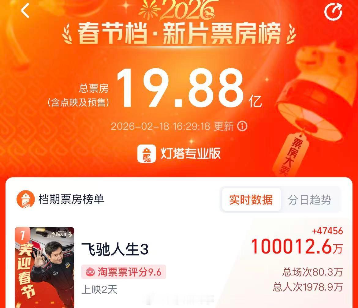 【飞驰人生3票房破10亿】飞驰人生3票房10亿断层第一2月18日大年初二,春节档电影上映第二日,《飞驰人生3》、《惊蛰无声》等热门影片票房持续上升。网络平台数据显示,截至发稿,电影《飞驰人生3》总票房已突破10亿,位列春节档电影票房榜榜首。飞驰人生3票房或超50亿