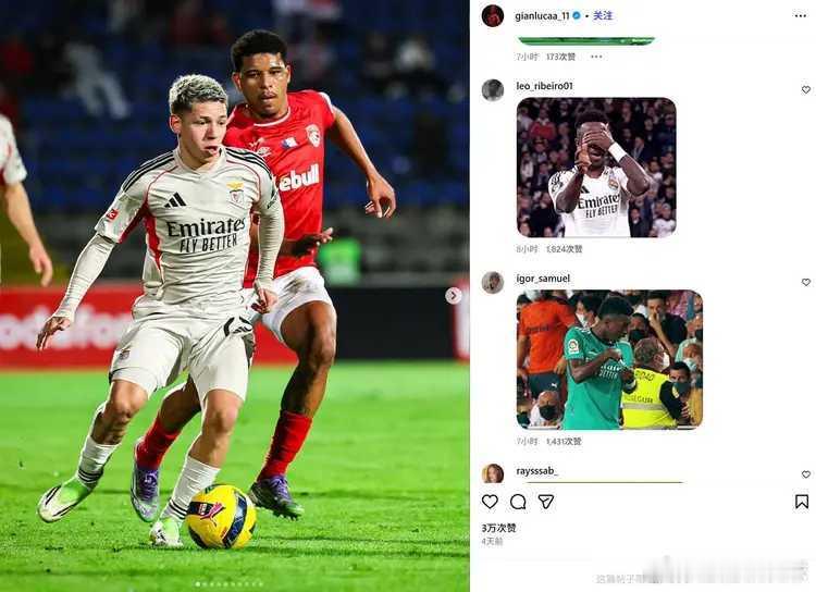02月18日在欧冠淘汰赛附加赛首回合比赛中,皇马客场1-0击败本菲卡,比赛过程中,维尼修斯遭到本菲卡球员普雷斯蒂安尼的种族歧视,普雷斯蒂安尼在社交媒体上发表动态,否认自己有种族歧视行为。普雷斯蒂安尼在社交媒体上写道:“我要澄清的是,我从未向维尼修斯发表过种族歧视言论,他不幸误解了自己听到的内容。我从未对任何人进行种族歧视,对于皇马球员们对我发出的威胁,我深表遗憾。”维尼修斯本菲卡vs皇马