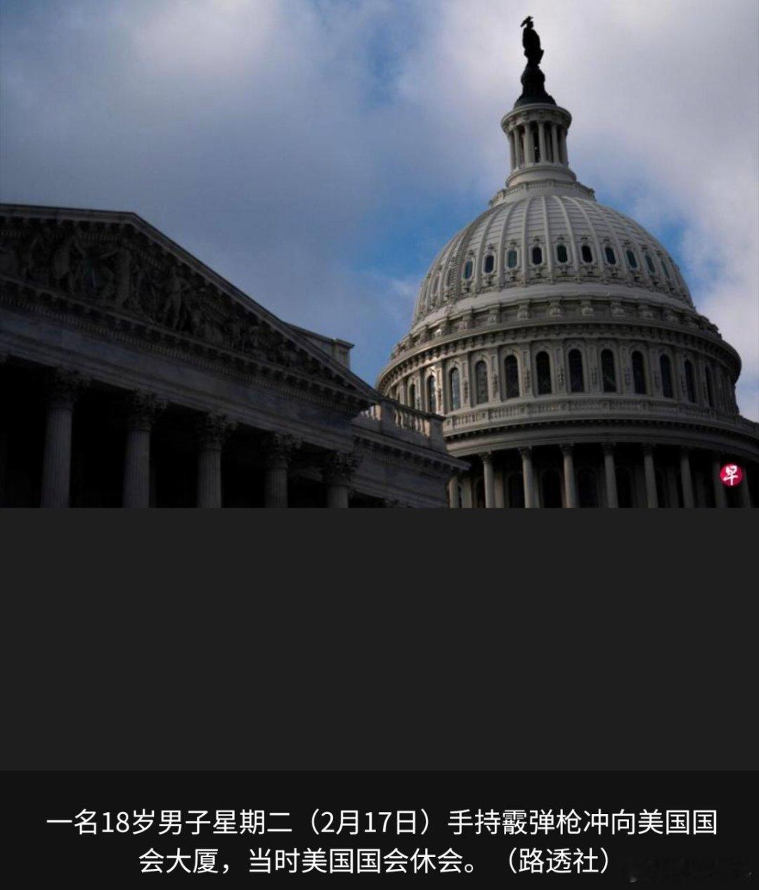 《纽约时报》报道,美国国会警察局局长沙利文星期二(2月17日)下午在记者会上说,被捕男子18岁,身穿战术背心,并携带了额外的弹药。当时国会休会,无人在此事件中受伤。