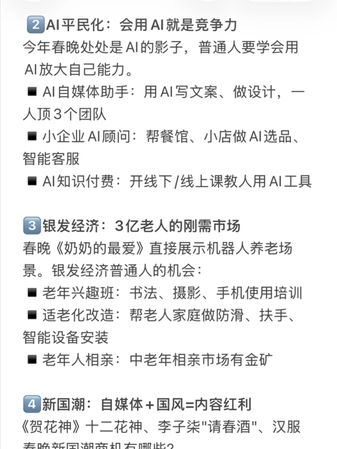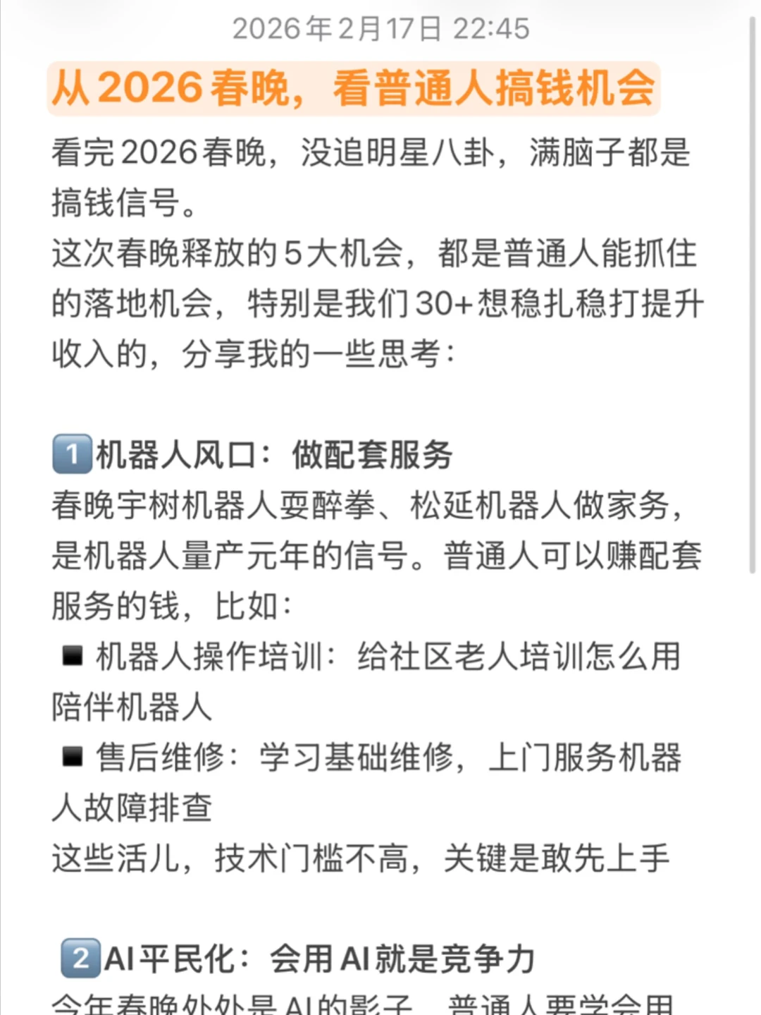 看完2026春晚,没追明星八卦,满脑子都是搞钱信号。这次春晚释放的5大机会,都是普通人能抓住的落地机会,特别是我们30+想稳扎稳打提升收入的,分享我的一些思考: