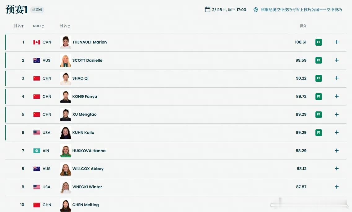 冬奥会,自由式滑雪女子空中技巧预赛第一轮,中国选手邵琪获得90.22分,孔凡钰89.72分,徐梦桃89.29分,分别位列第3、4、5名,率先晋级决赛。另一位中国选手陈梅婷得分86.71,排名第10,将参加预赛第2轮,争夺最后6个决赛资格。加油!