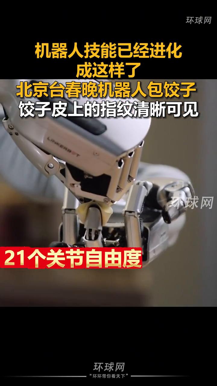 机器人技能已经进化成这样了。 环球网。 北京台春晚机器人包饺子,饺子皮上的指纹清晰可见。2月17日,起猛了!机器人技能已经进化成这样了,全国首次实现机器人巧手包饺子。在北京台春晚看见机器人包饺子了,饺子皮上的几枚指纹都清晰可见。21个关节自由度,0.8秒的开合速度。