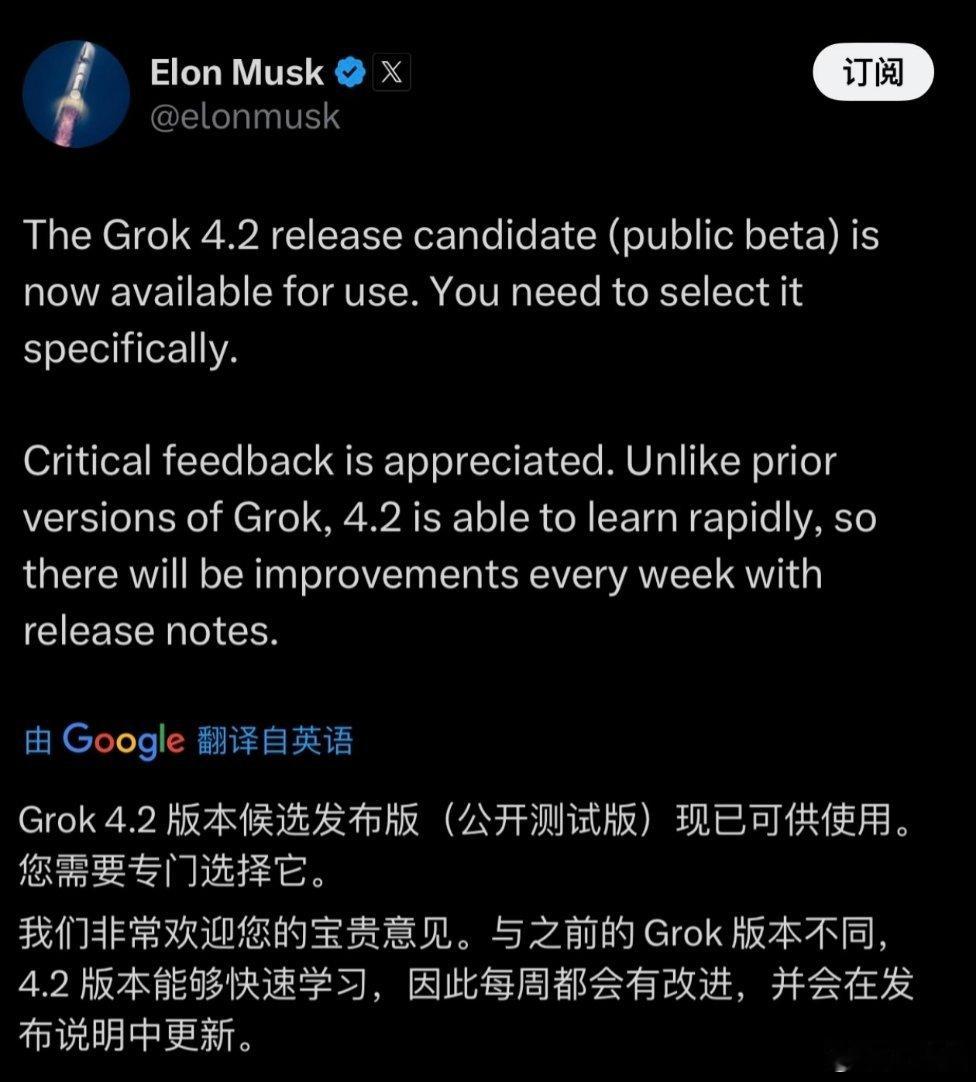 马斯克官宣Grok4.2公开测试版上线,具备快速学习能力
