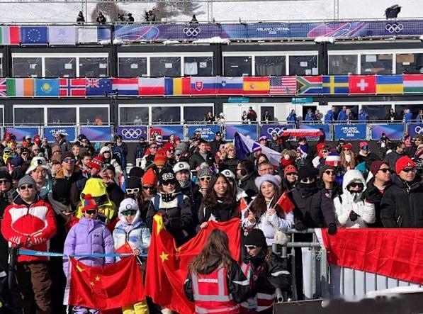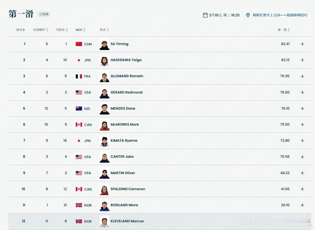 米兰冬奥会,单板滑雪男子坡面障碍技巧决赛,12位选手全部完成第一滑,苏翊鸣第五位登场,顺利完成技术动作,最后一个跳台区拿出反脚1800的大招完美落地,拿到82.41的高分,目前排名第一位。从现场画面可以看到,很多观众为苏翊鸣加油,中国红十分亮眼!